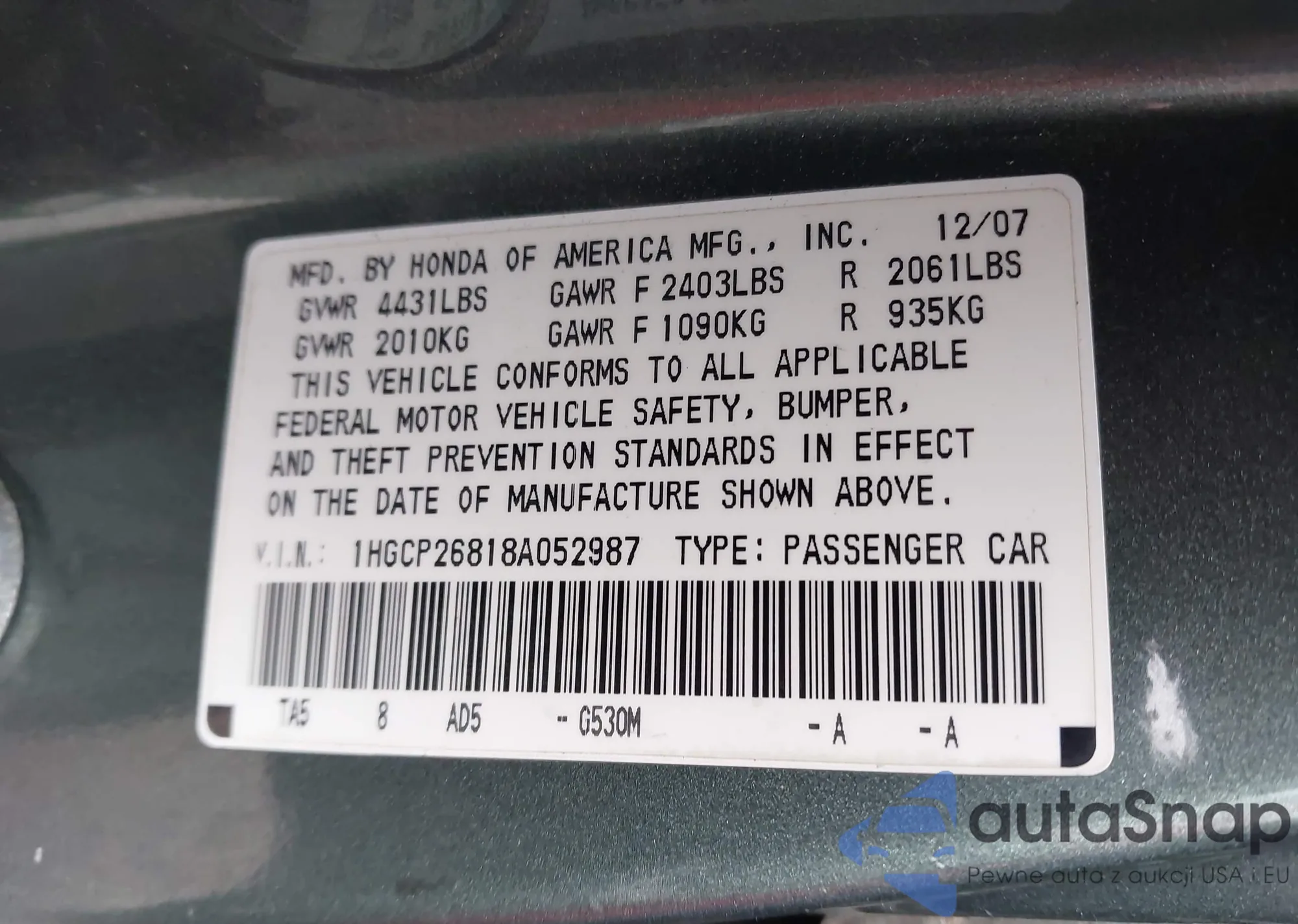• VIN 1HGCP26818A052987