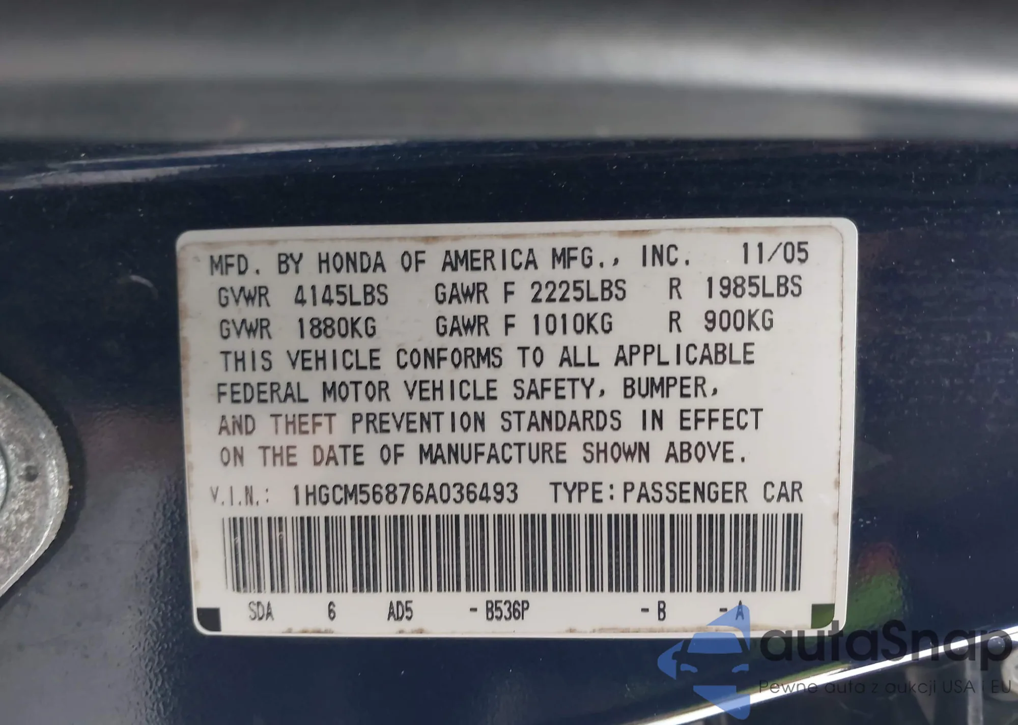 LOT: 43849668 VIN: 1HGCP36858A060970
