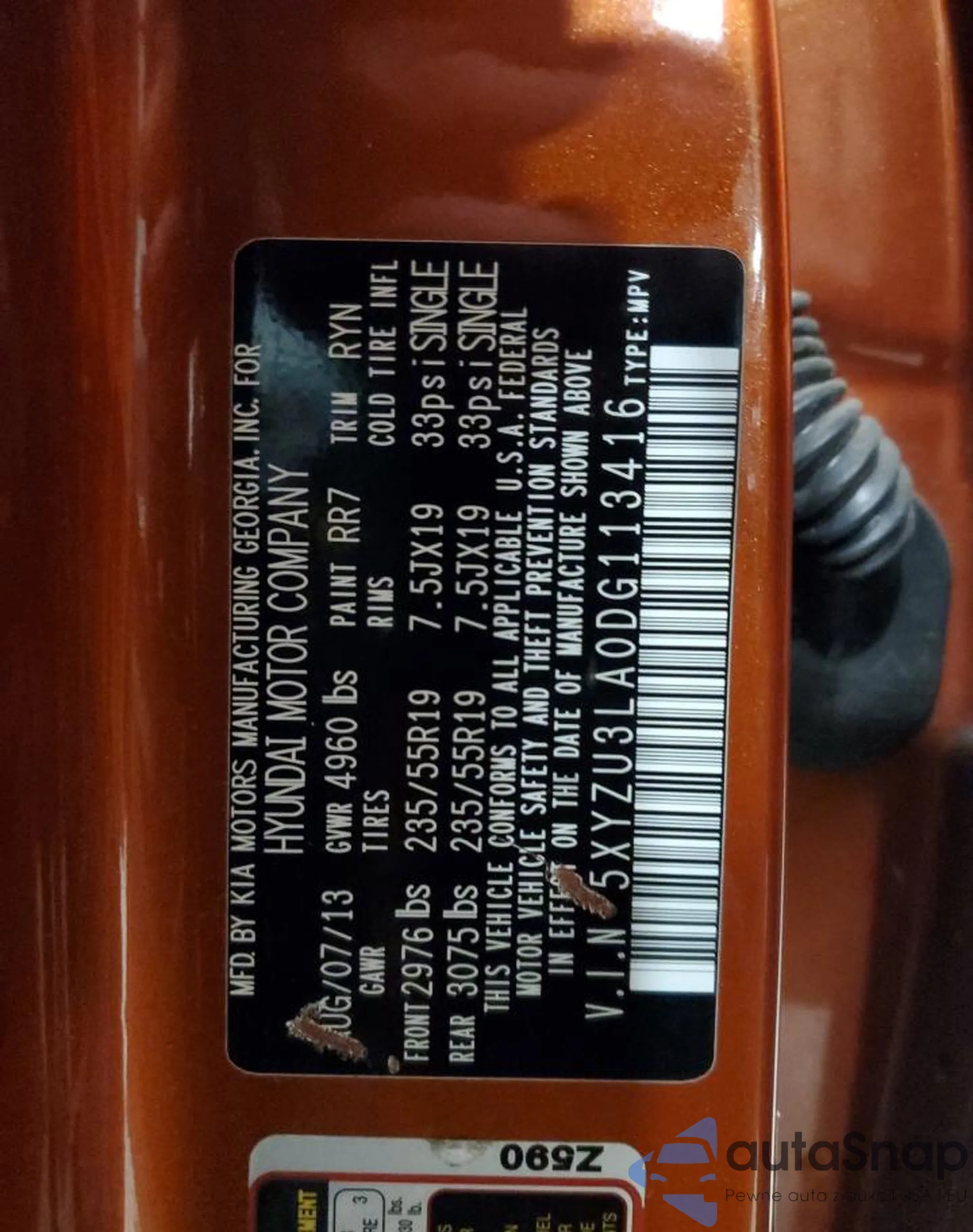 • VIN 5XYZU3LA0DG113416