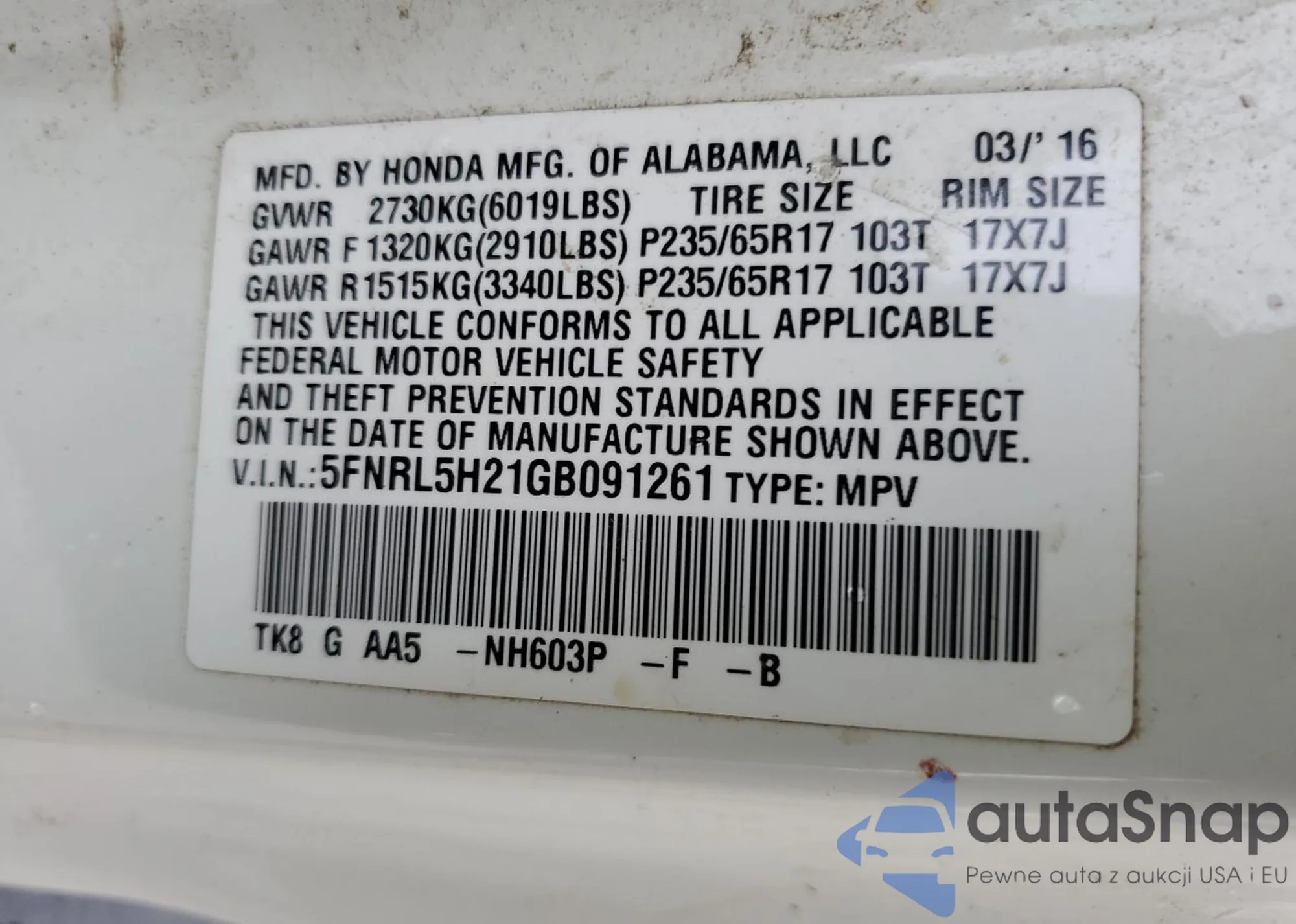 • VIN 5FNRL5H21GB091261