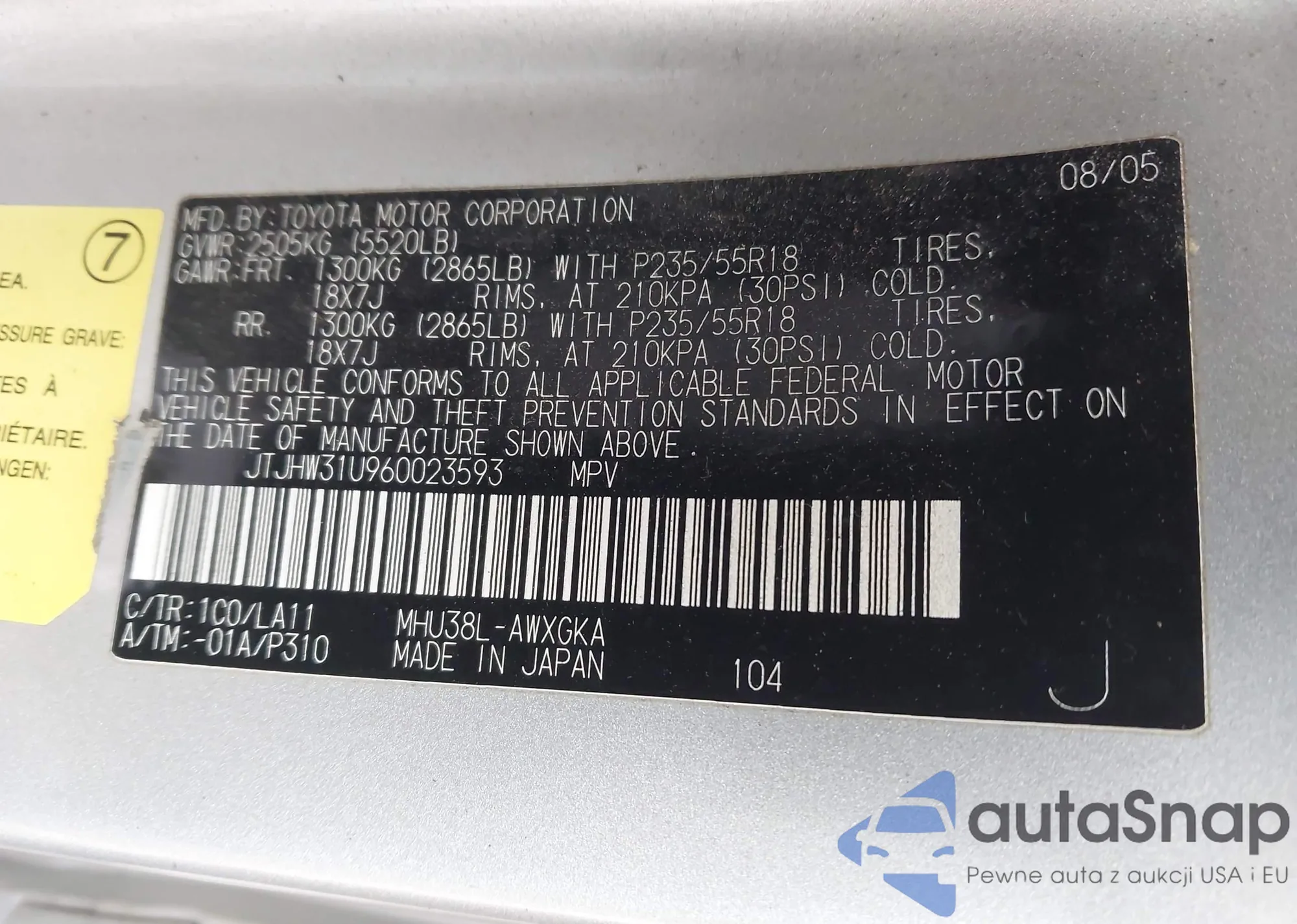 LOT: 43958318 VIN: JTJHW31U960023593