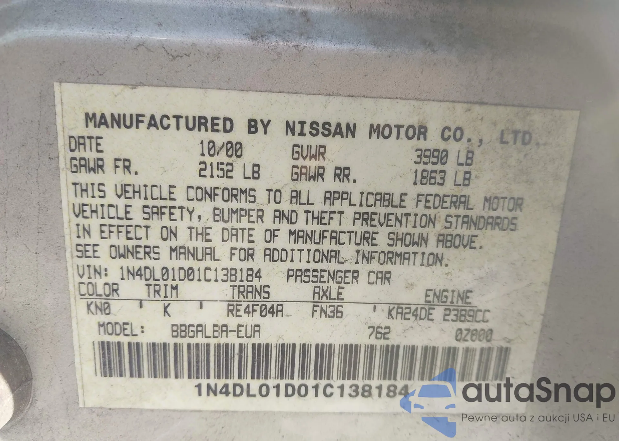 LOT: 43680911 VIN: 1N4DL01D01C138184