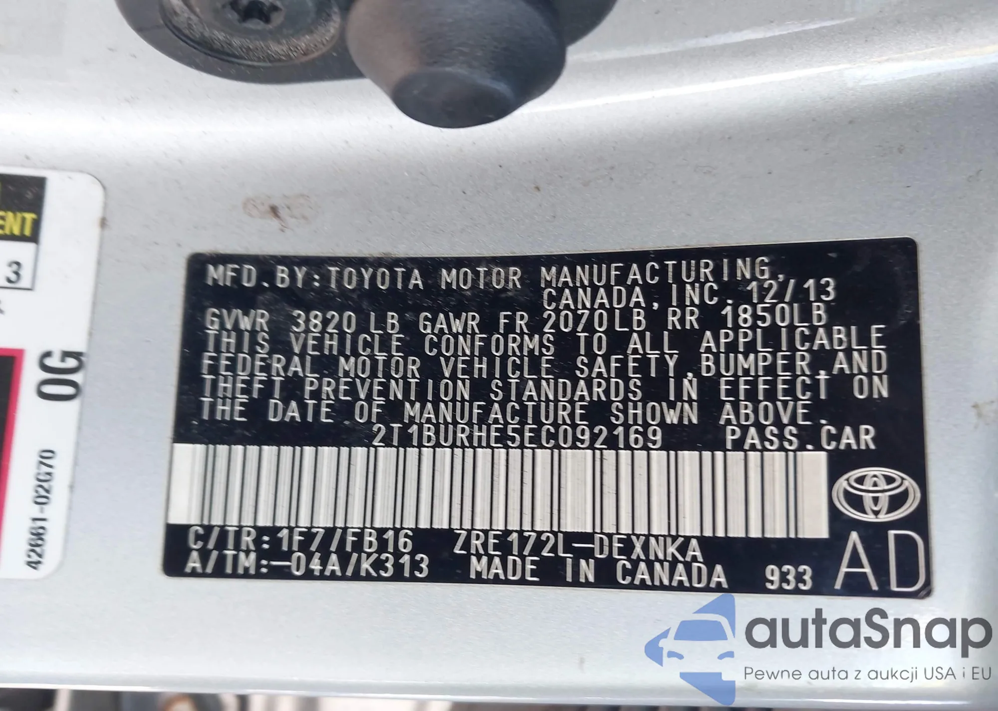 LOT: 43925148 VIN: 2T1BURHE5EC092169