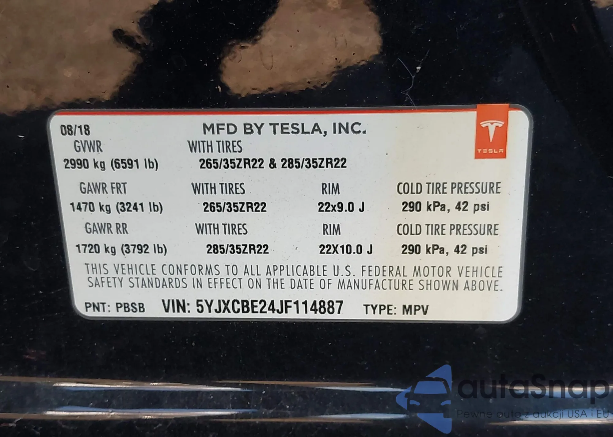 2018 Tesla Model X 100D/75D/P100D z USA, uszkodzony, nr VIN 5YJXCBE24JF114887