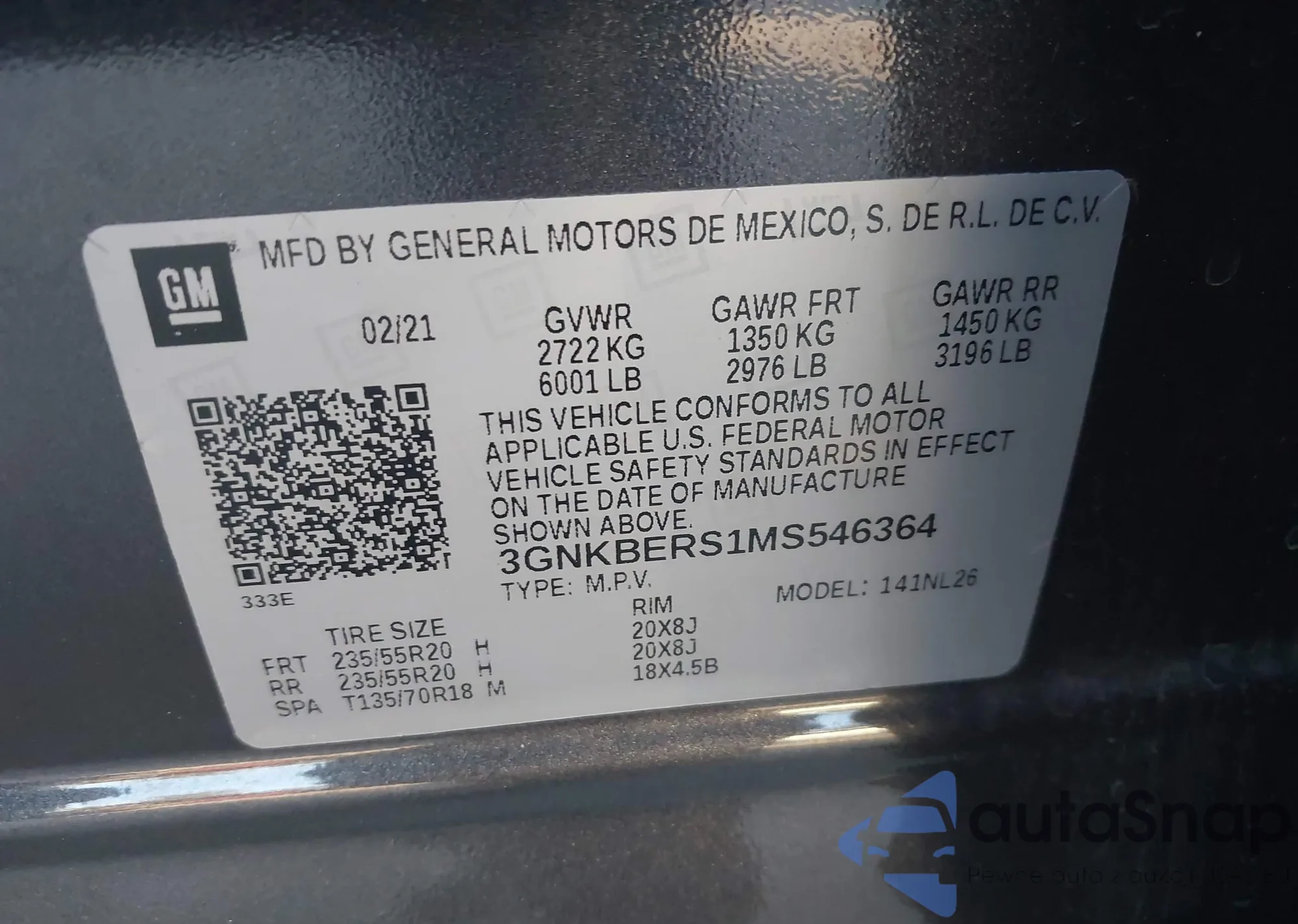 LOT: 43812101 VIN: 3GNKBERS1MS546364