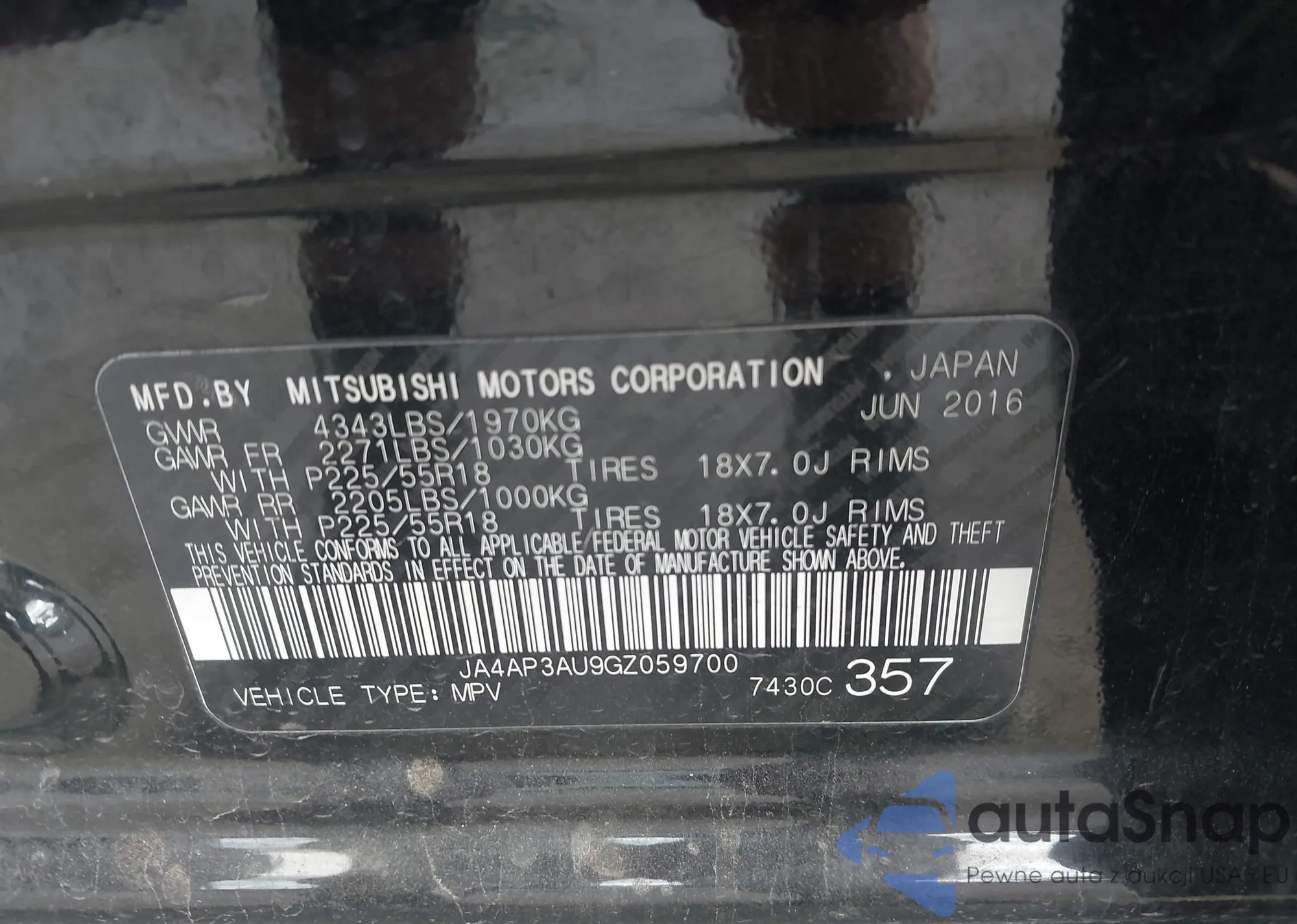 LOT: 43287694 VIN: JA4AP3AU9GZ059700