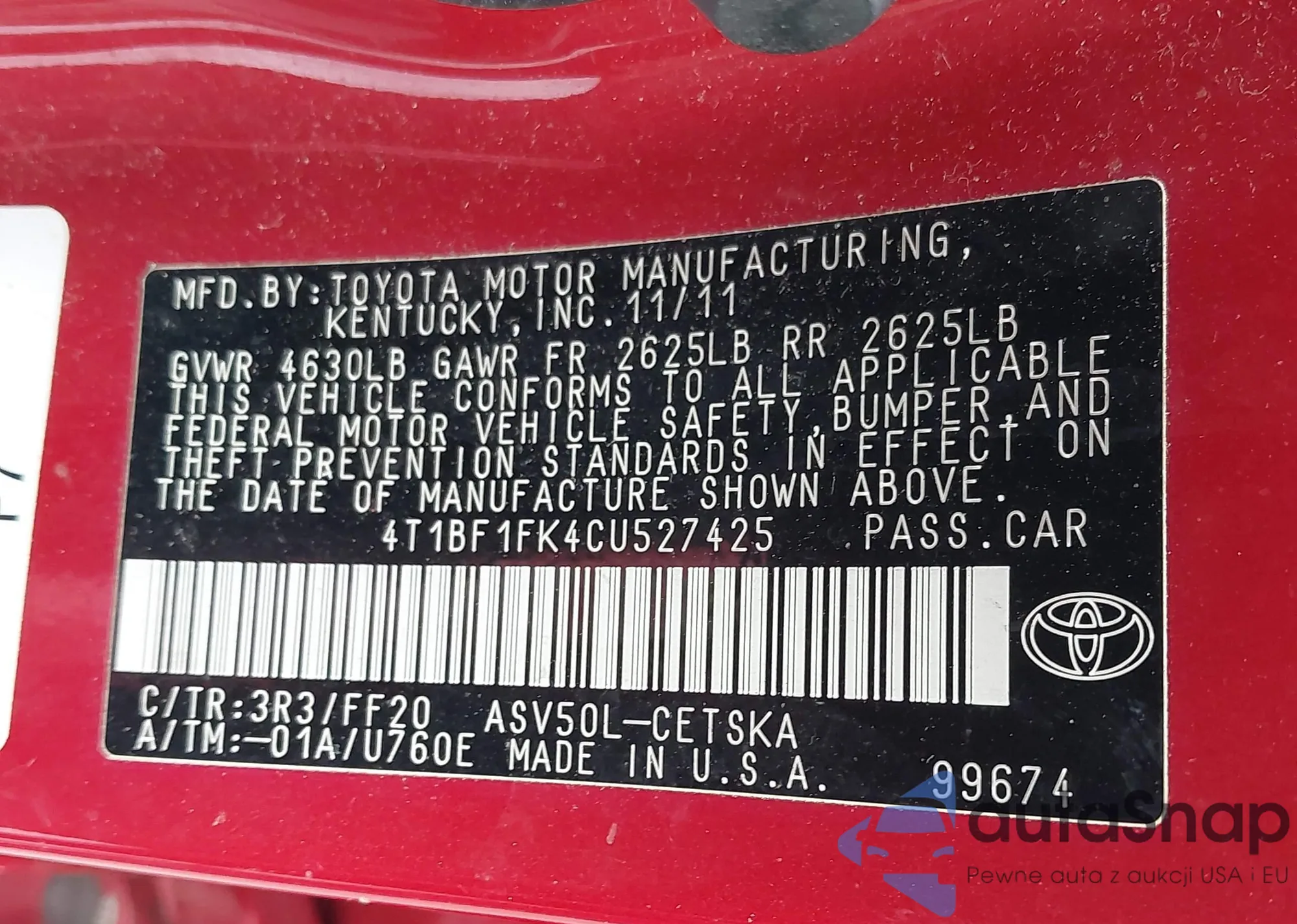 • VIN 4T1BF1FK4CU527425