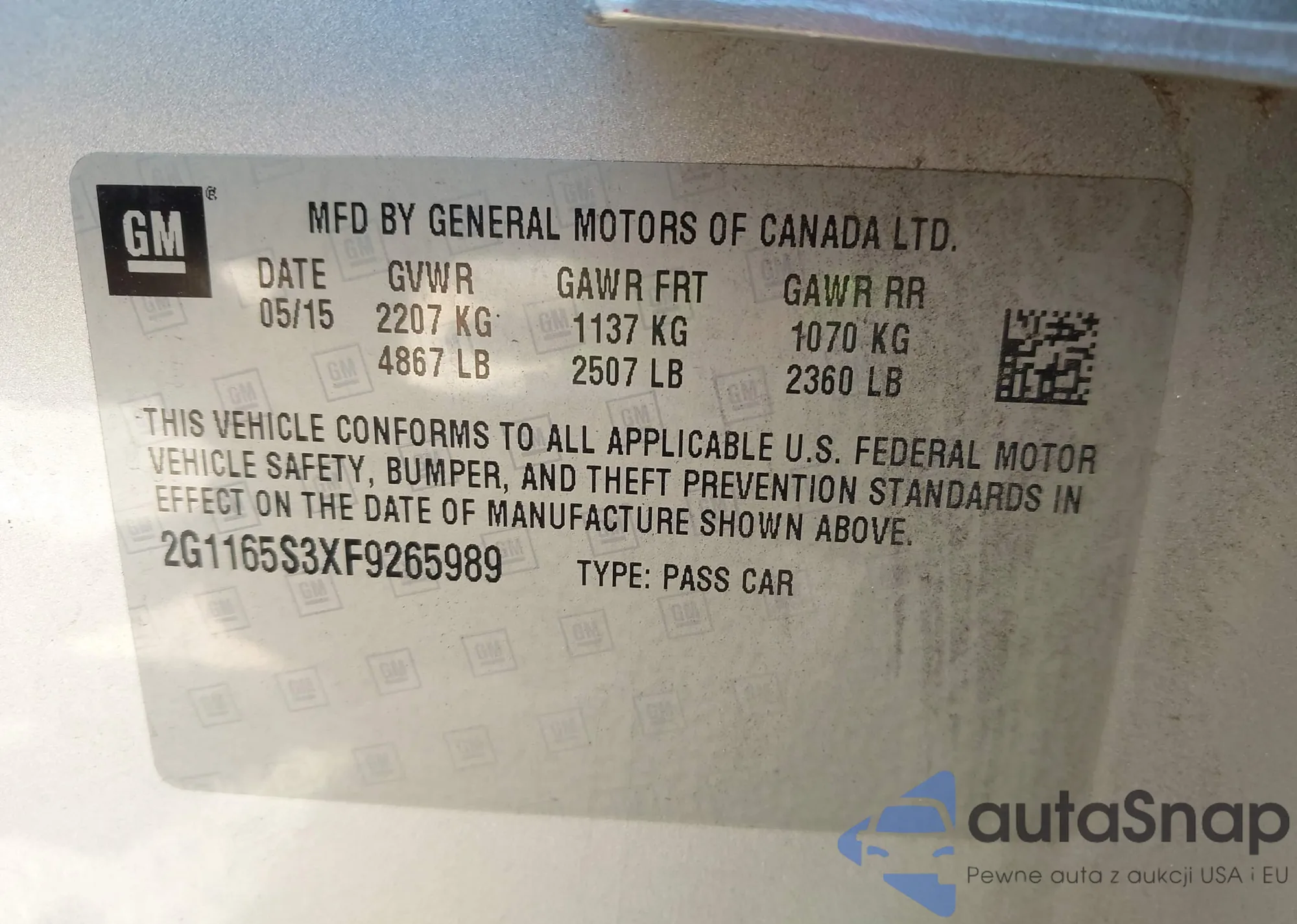 LOT: 43154472 VIN: 2G1165S3XF9265989