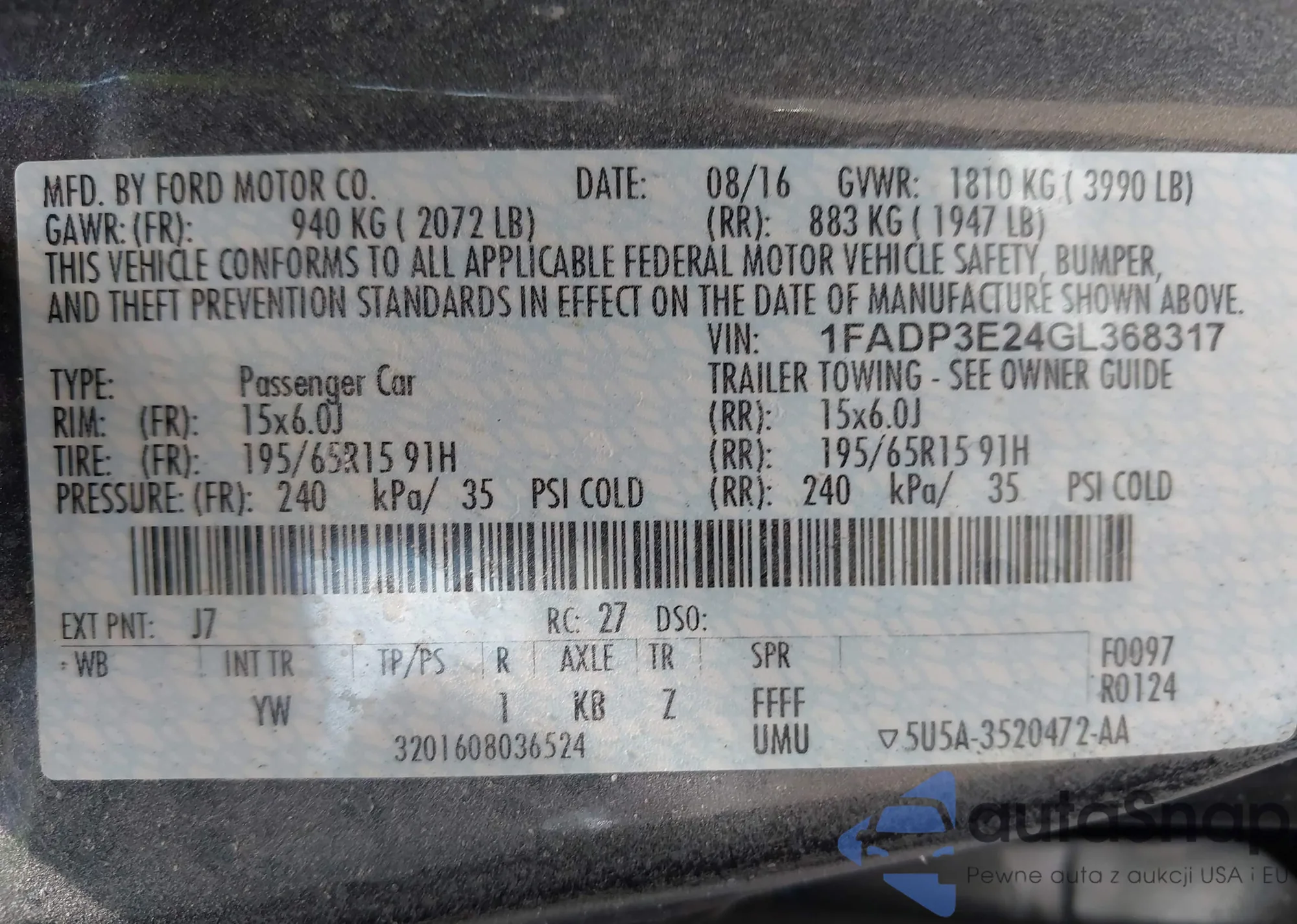 • VIN 1FADP3E24GL368317