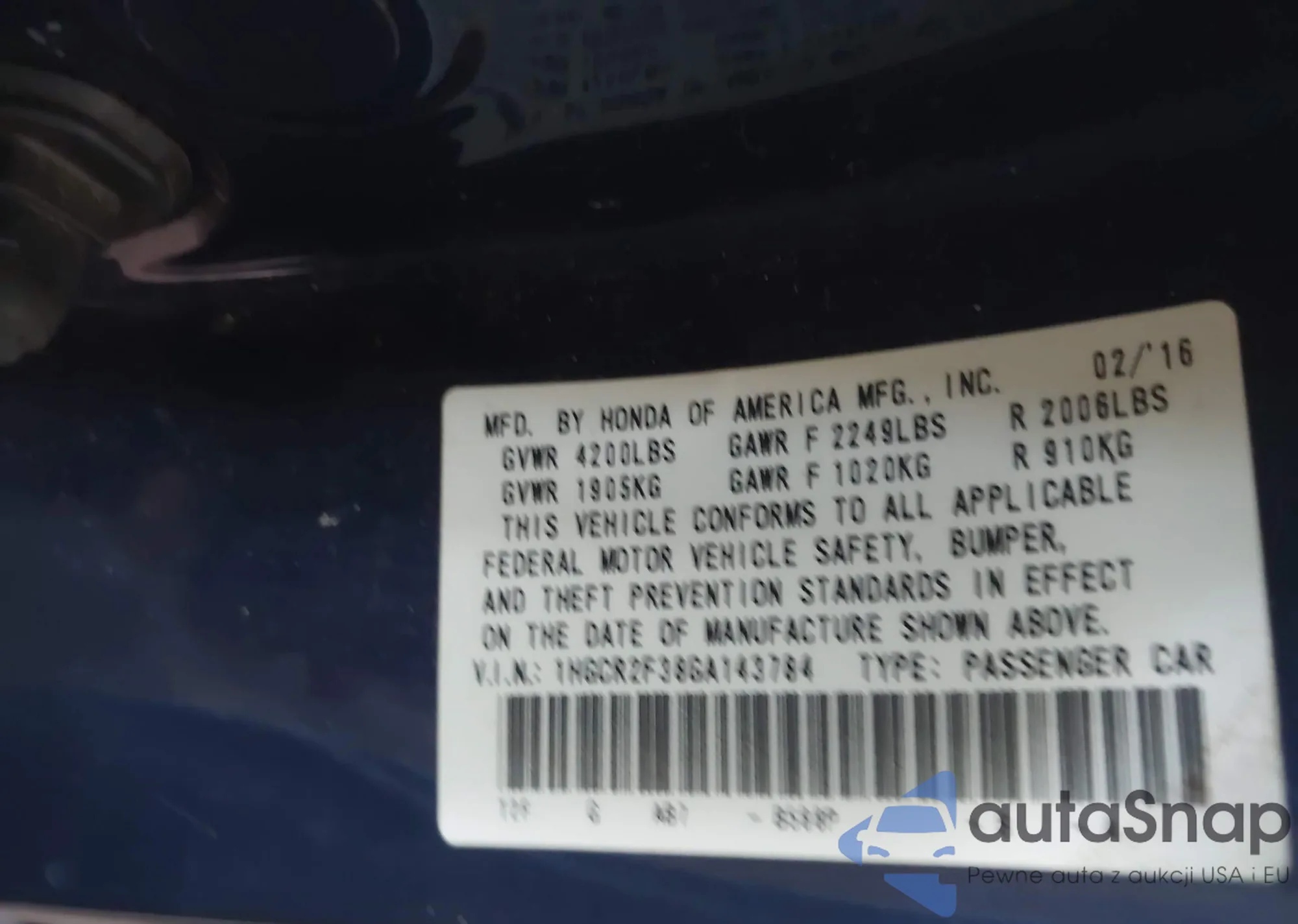 LOT: 43032494 VIN: 1HGCR2F38GA143784