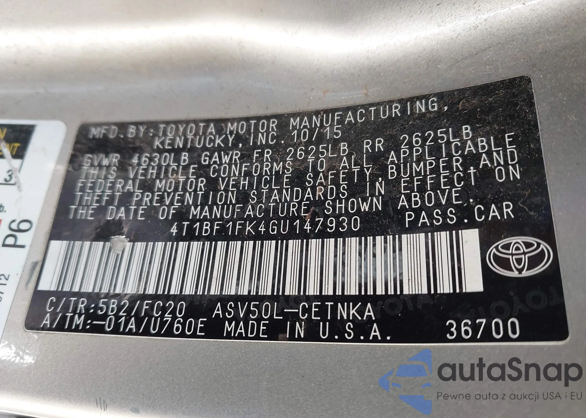 • VIN 4T1BF1FK4GU147930