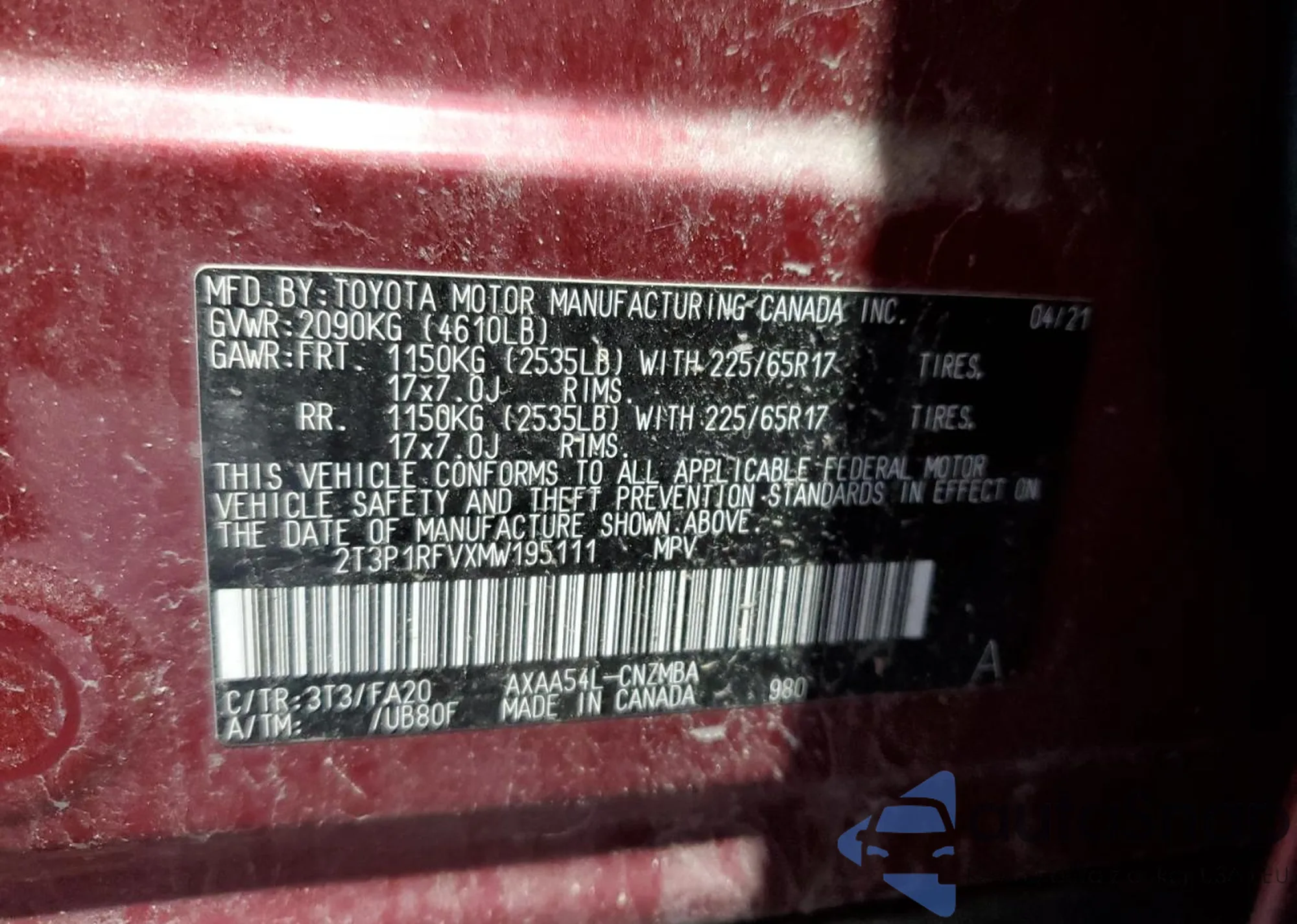 • VIN 2T3P1RFVXMW195111