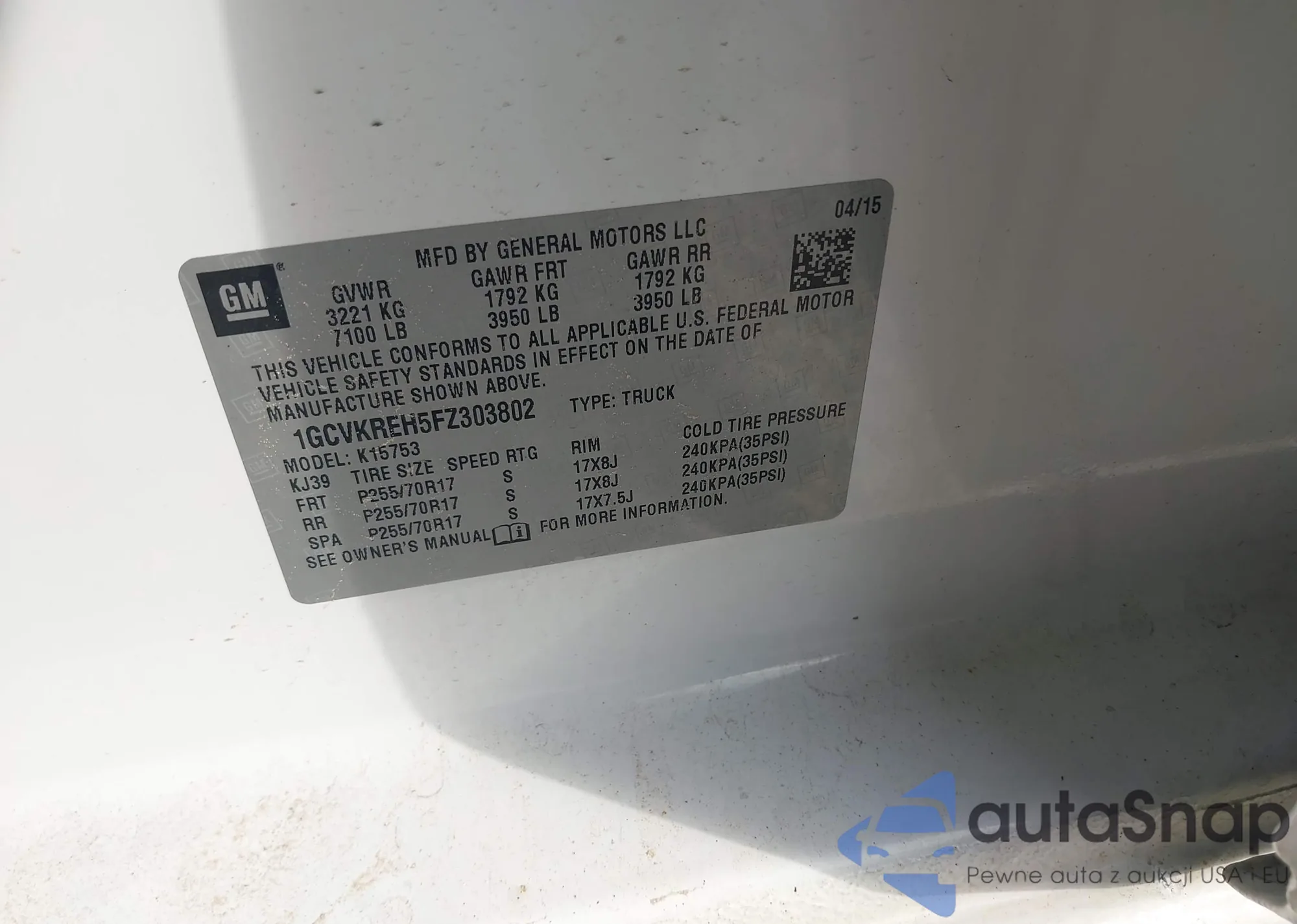 LOT: 43396237 VIN: 1GCVKREH5FZ303802