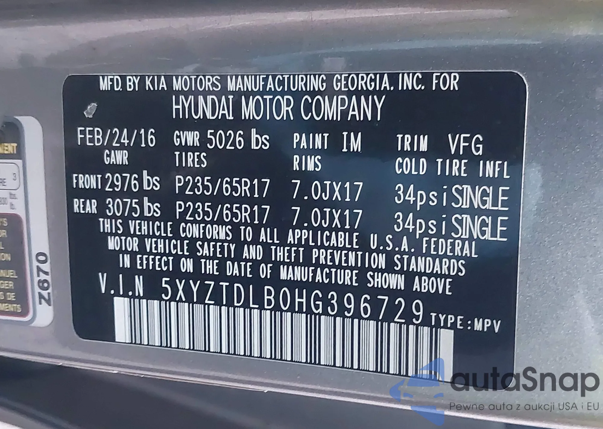 • VIN 5XYZTDLB0HG396729