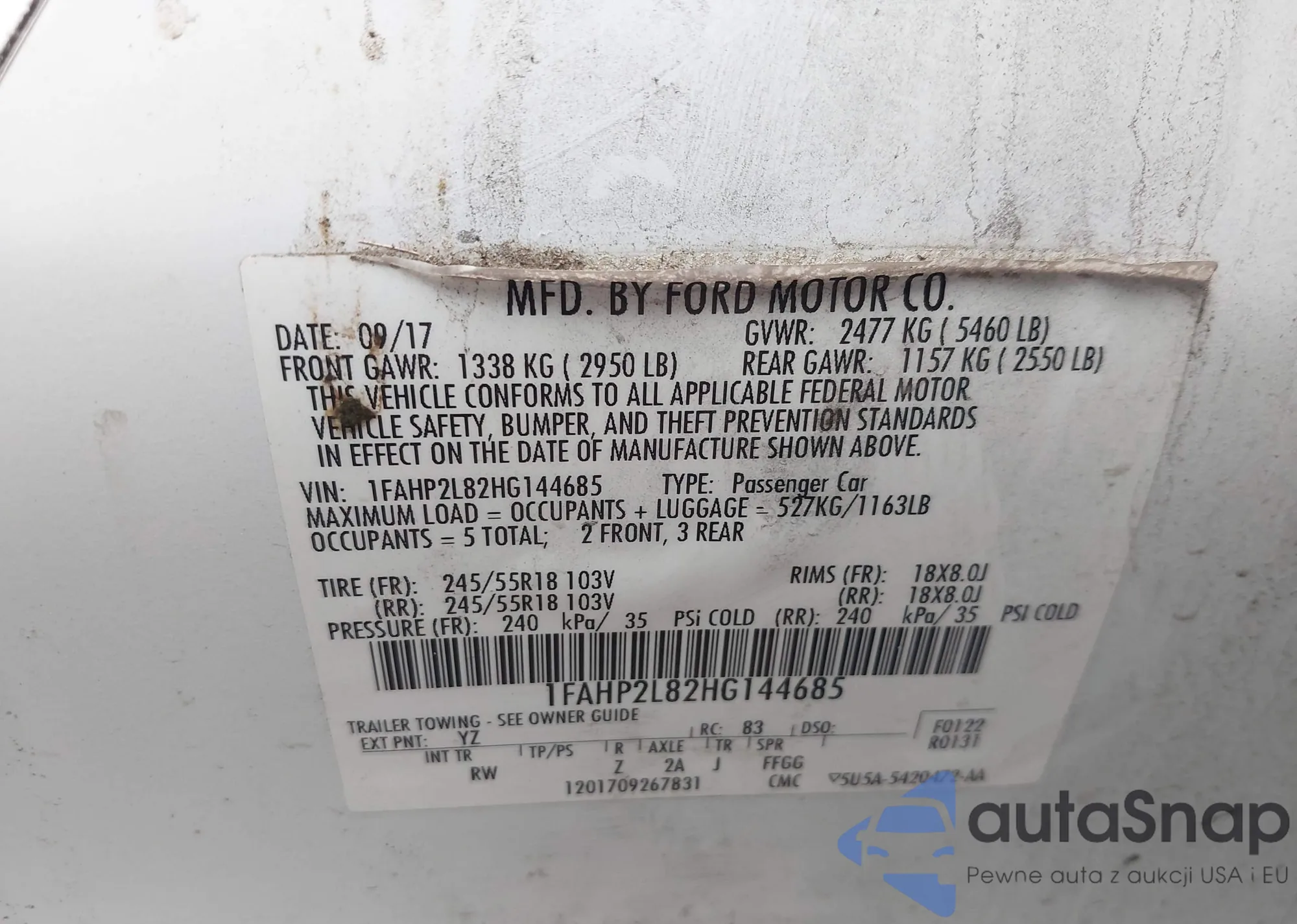 LOT: 43972662 VIN: 1FAHP2L82HG144685