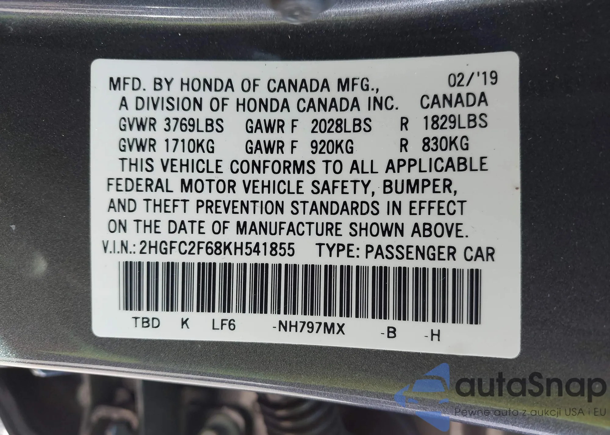 • VIN 2HGFC2F68KH541855