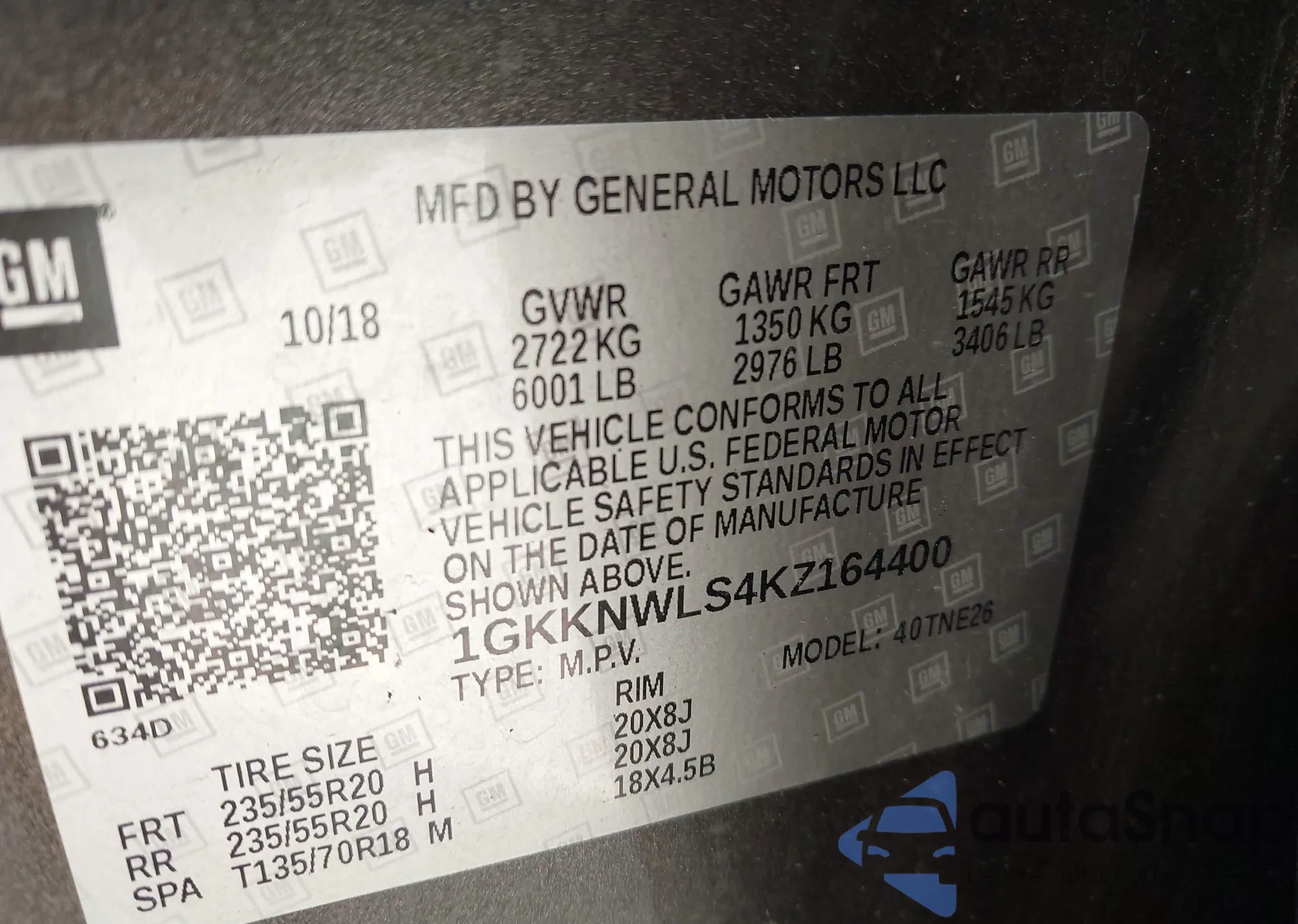 • VIN 1GKKNWLS4KZ164400