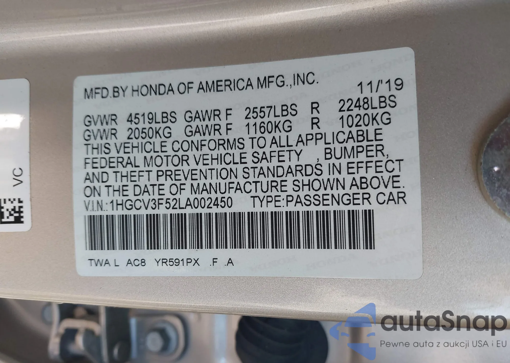 LOT: 43528334 VIN: 1HGCV3F52LA002450