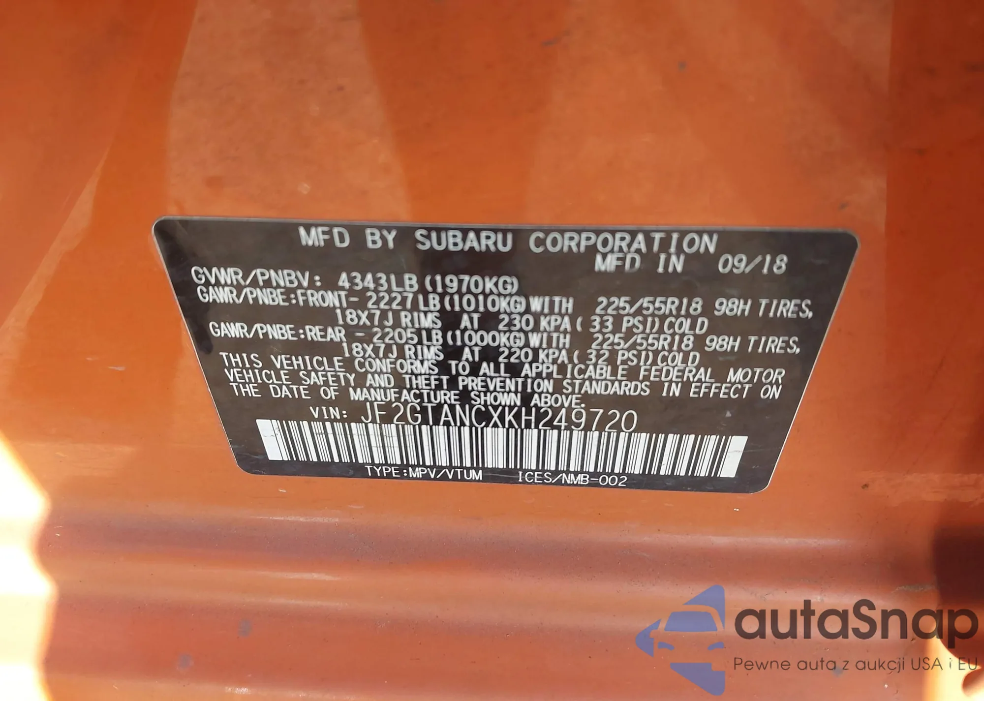 LOT: 43213639 VIN: JF2GTANCXKH249720