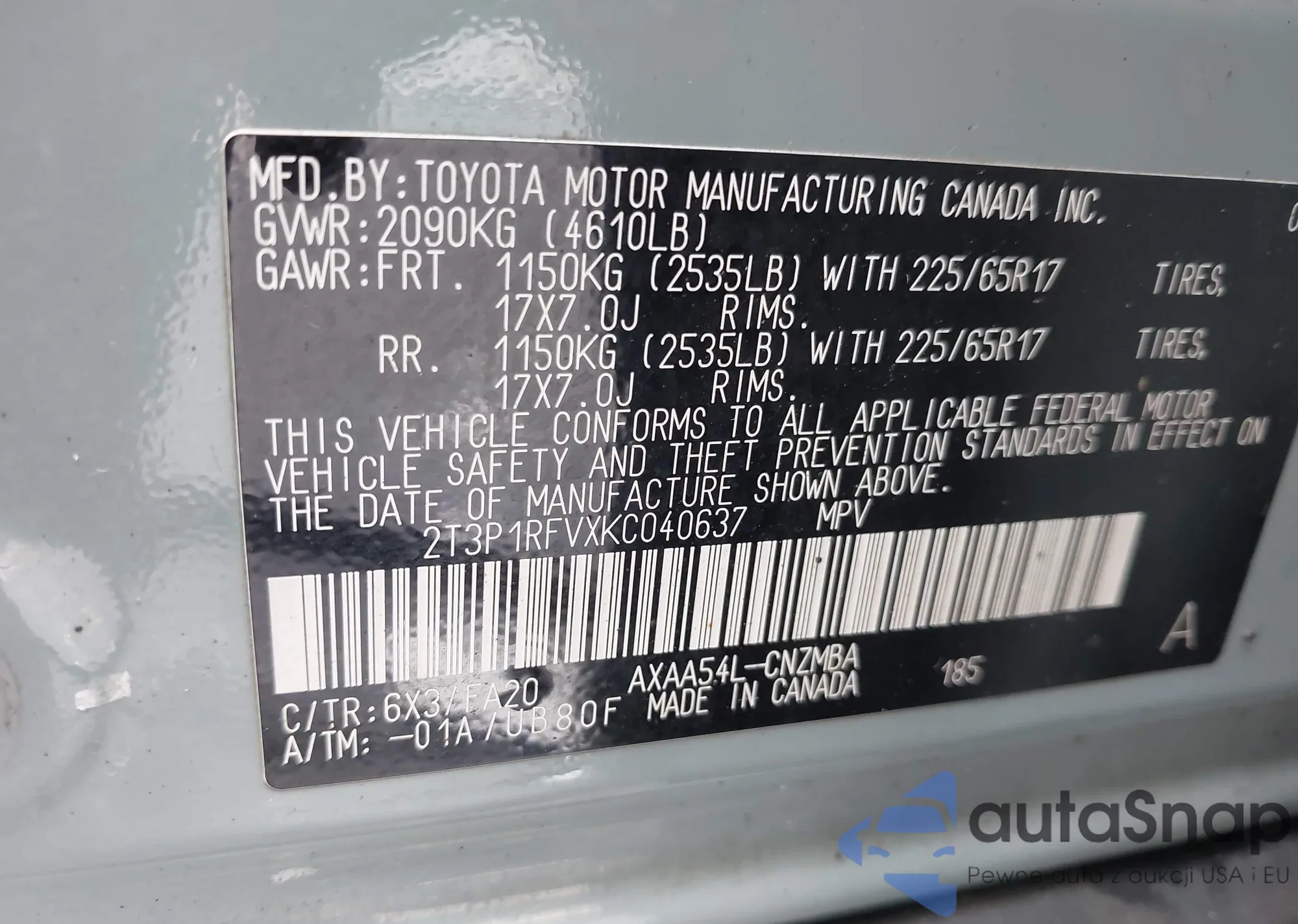 • VIN 2T3P1RFVXKC040637