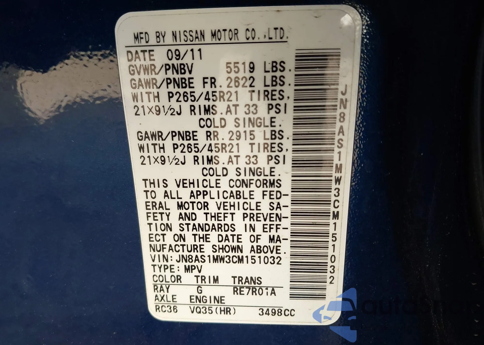 LOT: 42747735 VIN: JN8AS1MW3CM151032
