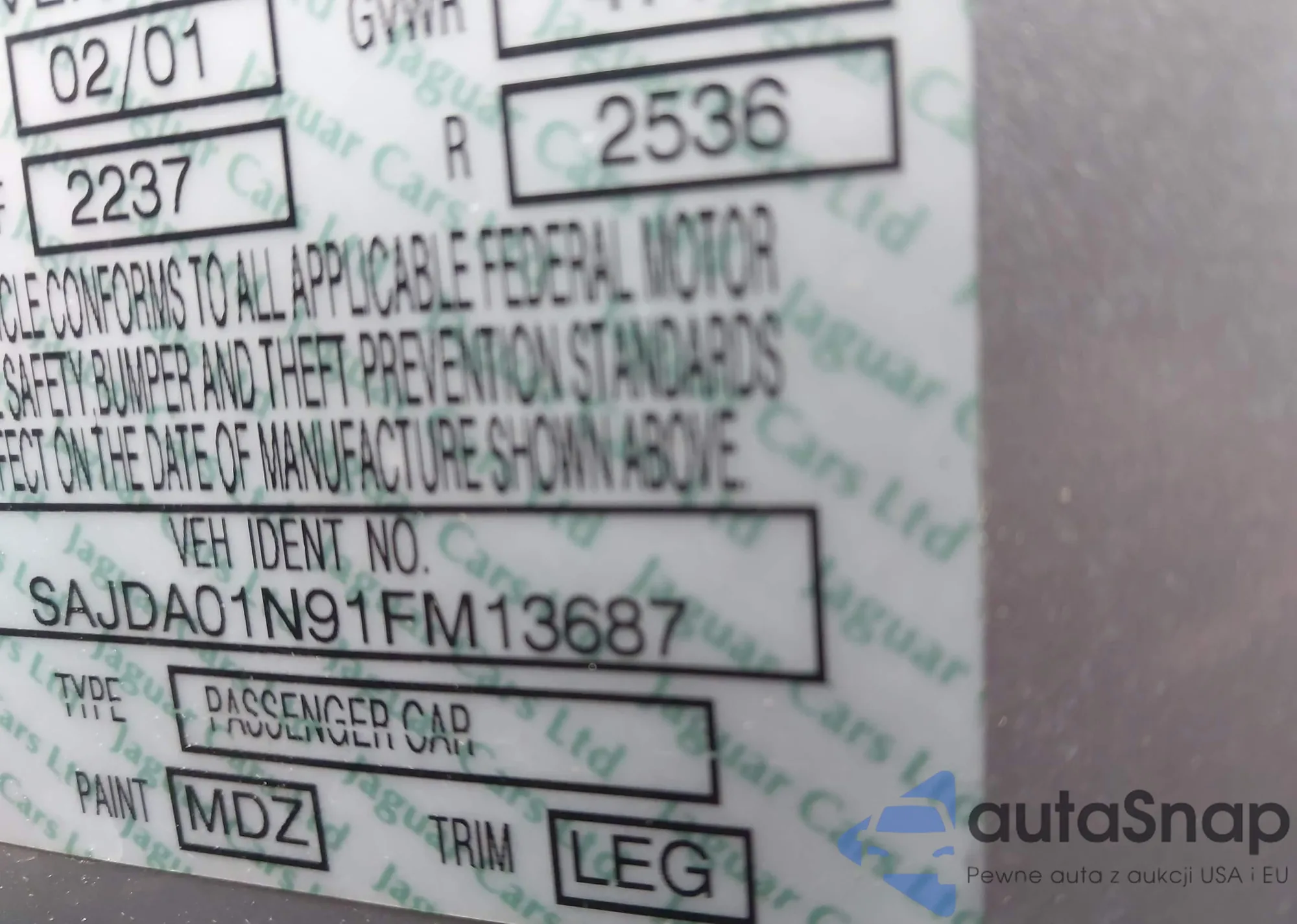 LOT: 44007498 VIN: SAJDA01N91FM13687