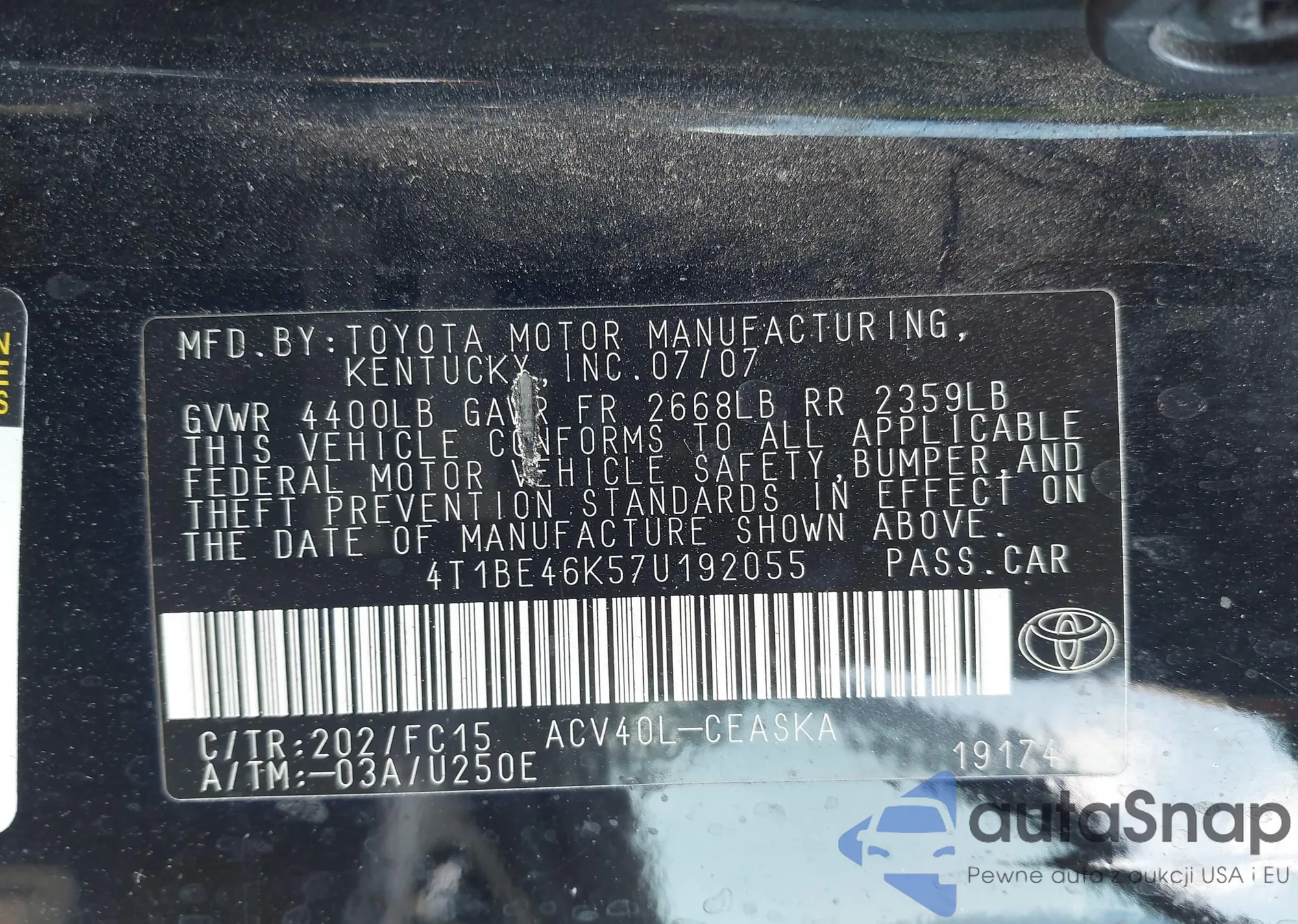 LOT: 43375930 VIN: 4T1BE46K57U192055