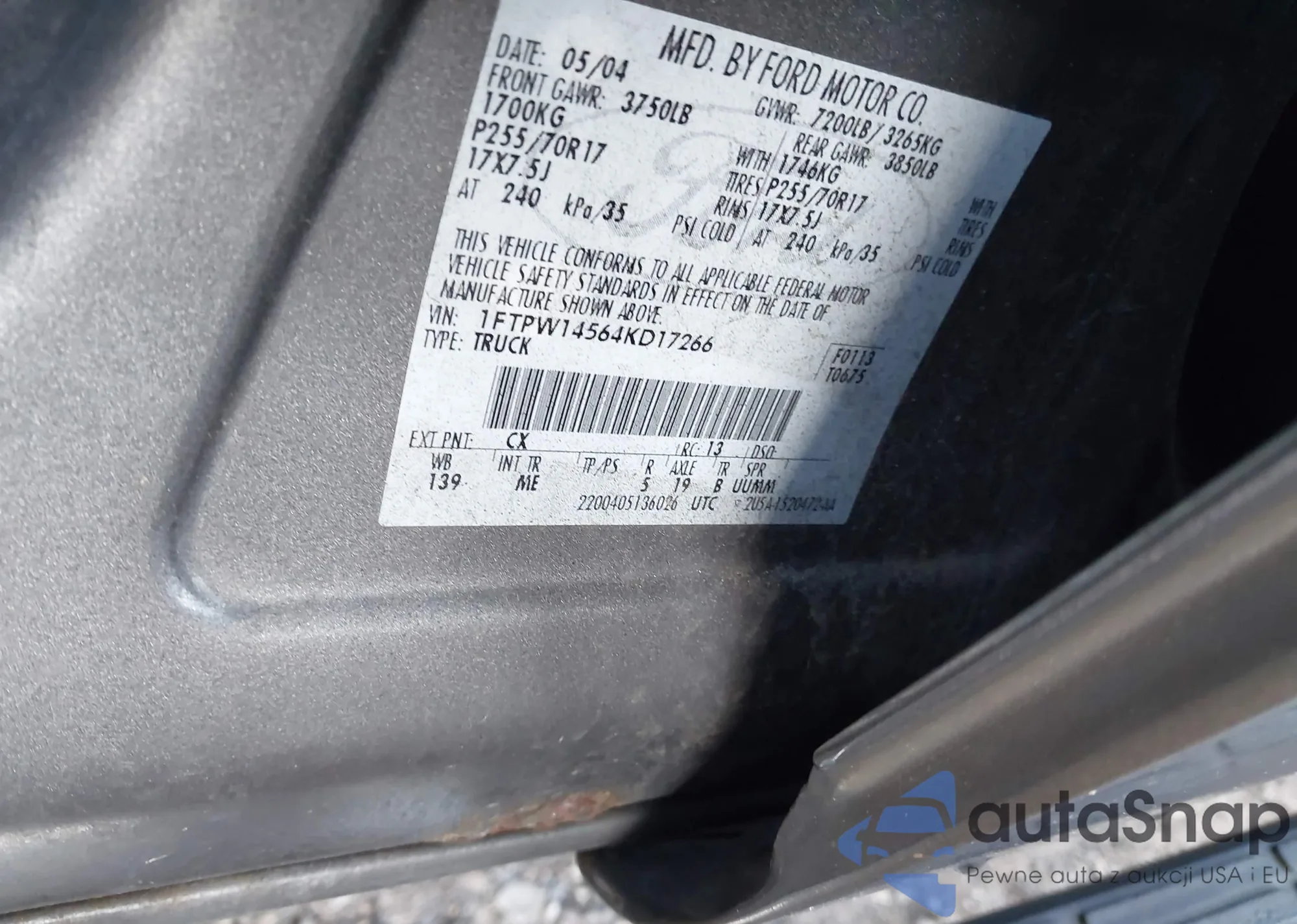 LOT: 43552132 VIN: 1FTPW14564KD17266