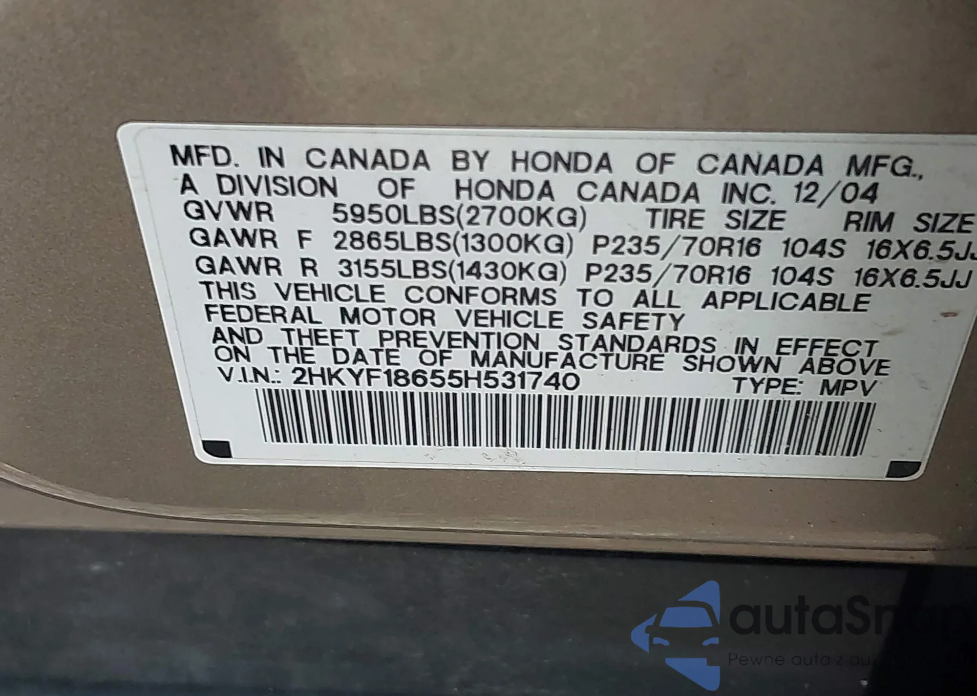 • VIN 2HKYF18655H531740