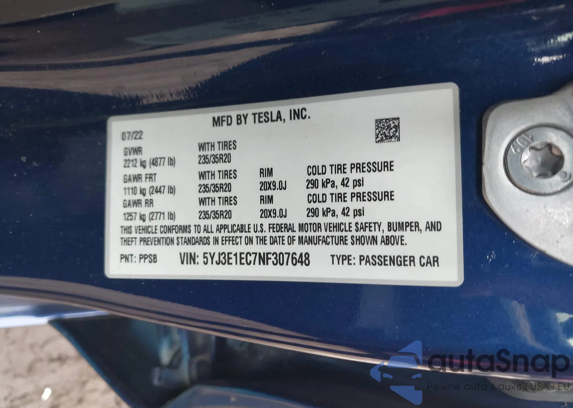 • VIN 5YJ3E1EC7NF307648