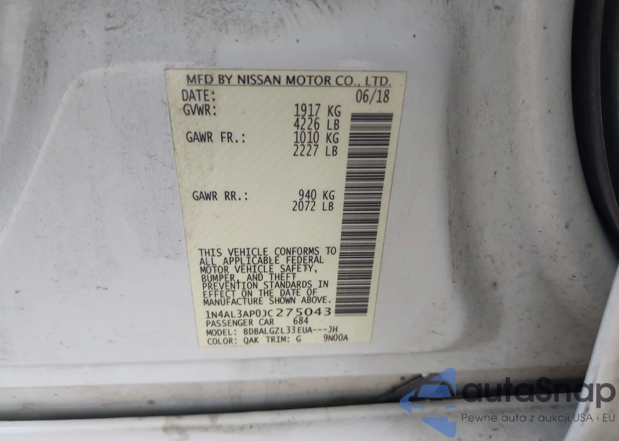 LOT: 43468211 VIN: 1N4AL3AP0JC275043