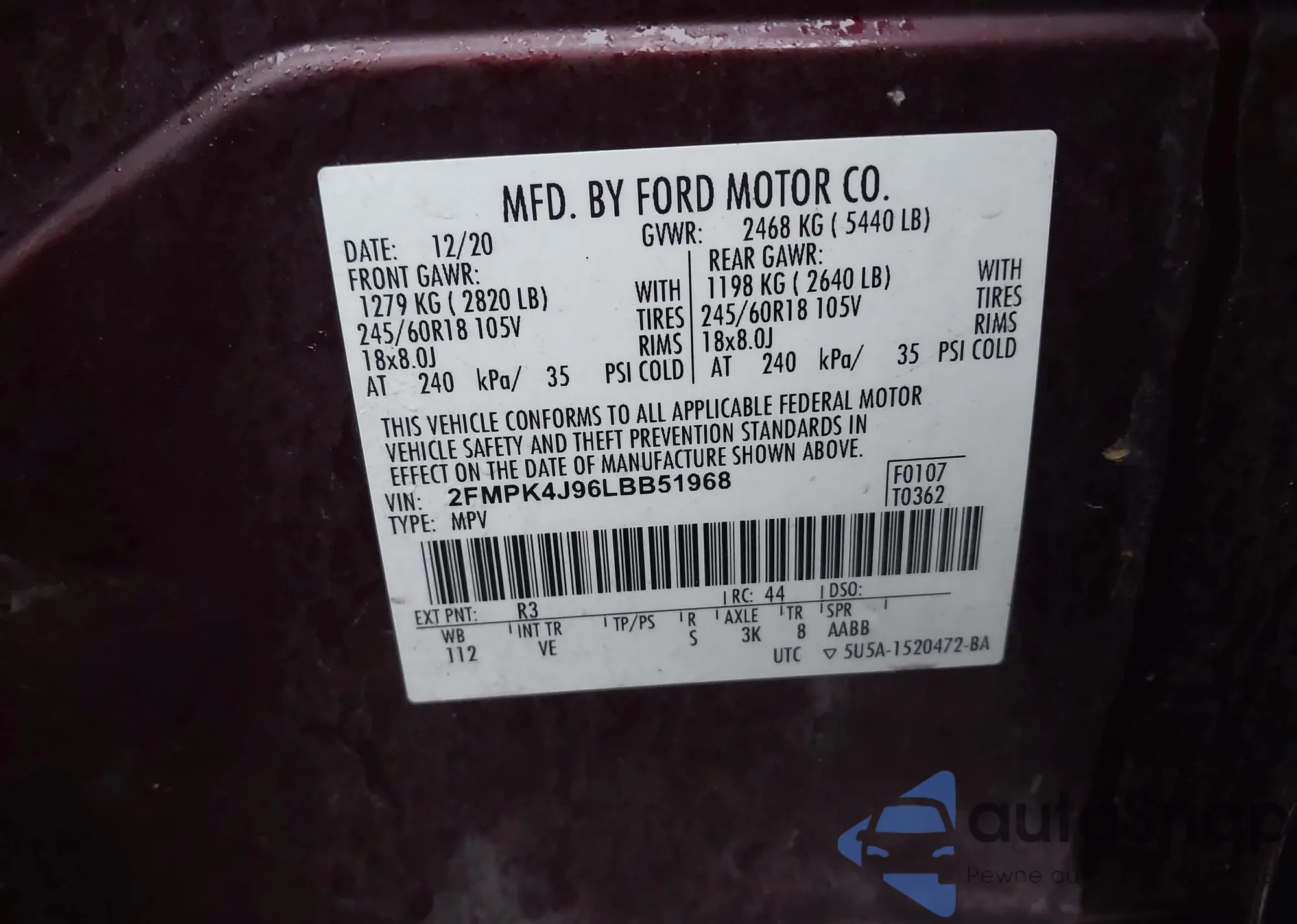 LOT: 43982529 VIN: 2FMPK4J96LBB51968