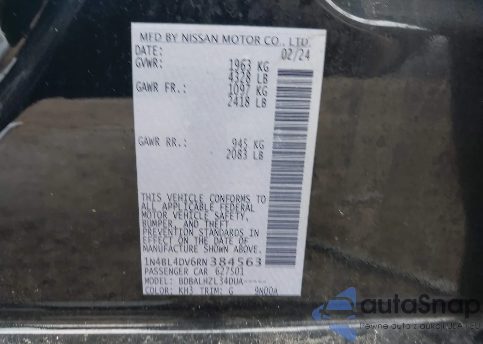• VIN 1N4BL4DV6RN384563