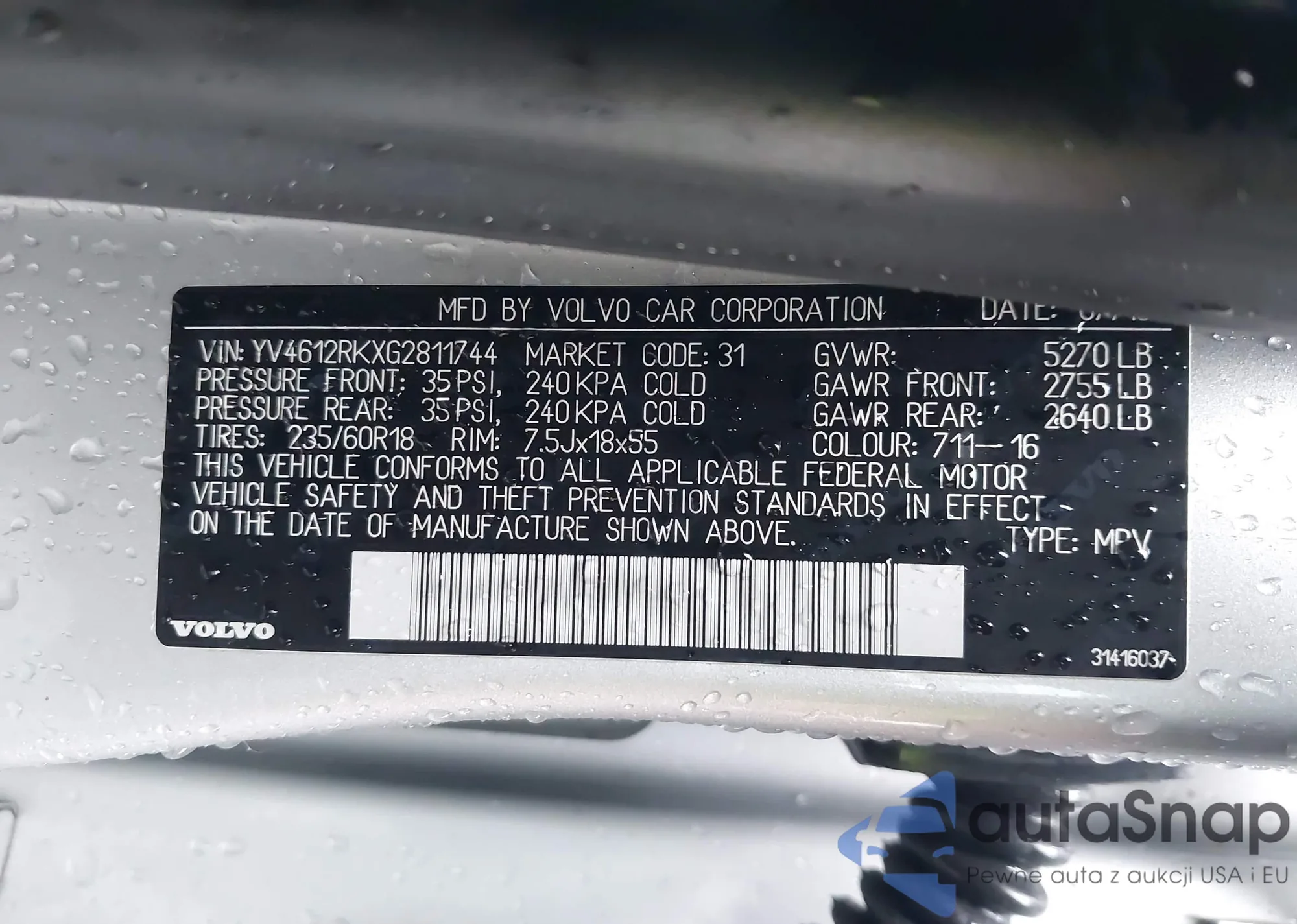 LOT: 43851050 VIN: YV4612RKXG2811744