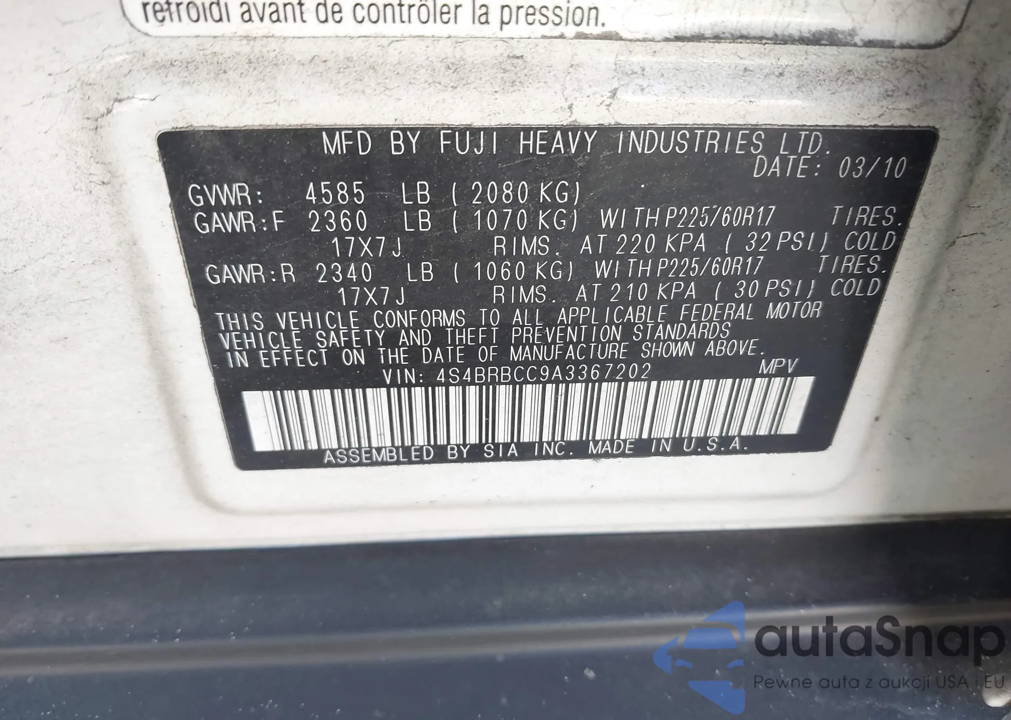 LOT: 43892034 VIN: 4S4BRBCC9A3367202