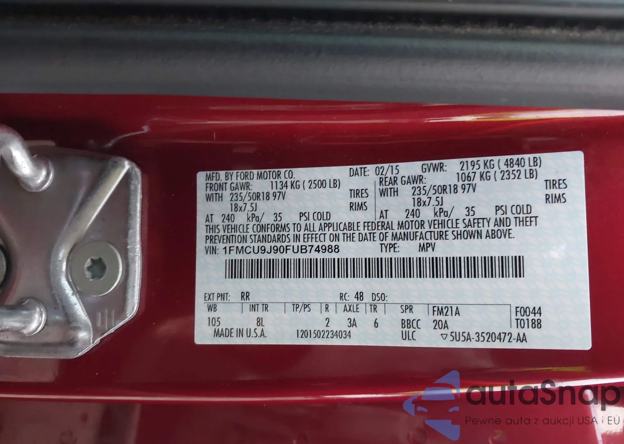 LOT: 43561618 VIN: 1FMCU9J90FUB74988