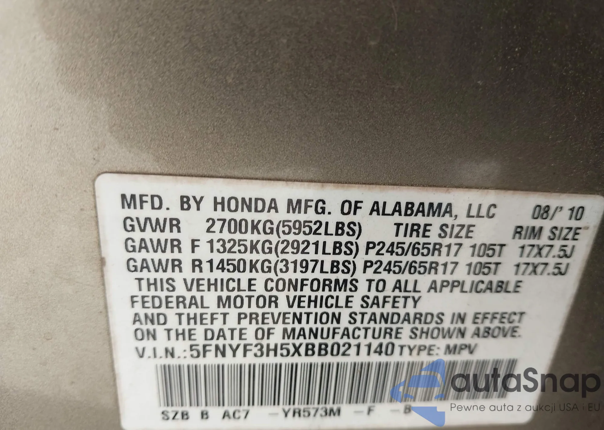 • VIN 5FNYF3H5XBB021140