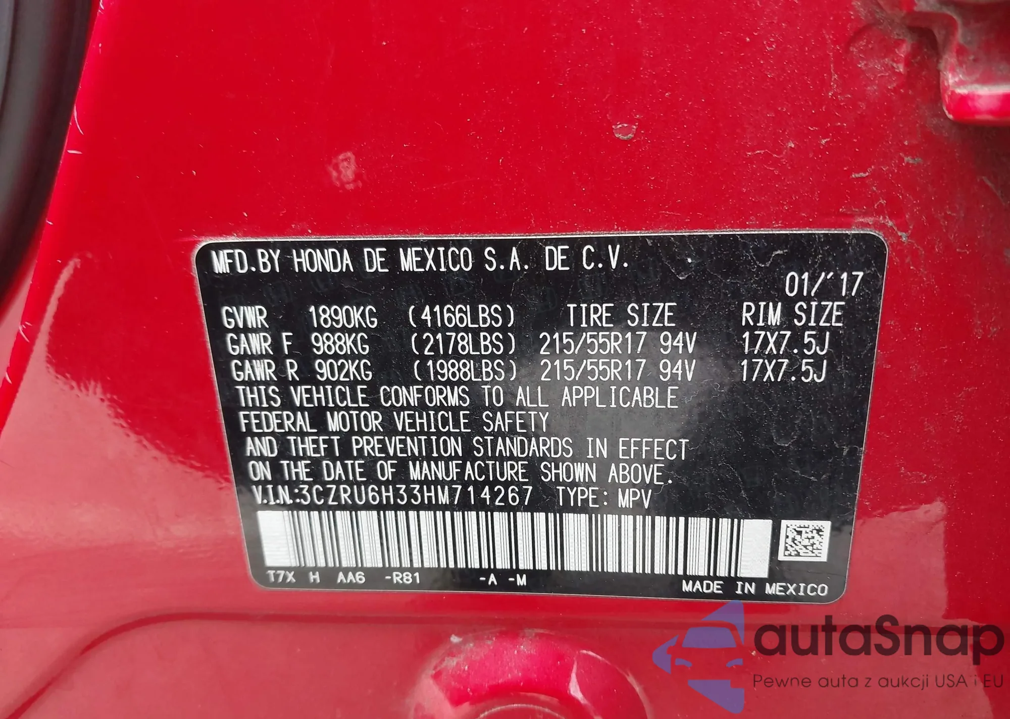 • VIN 3CZRU6H33HM714267