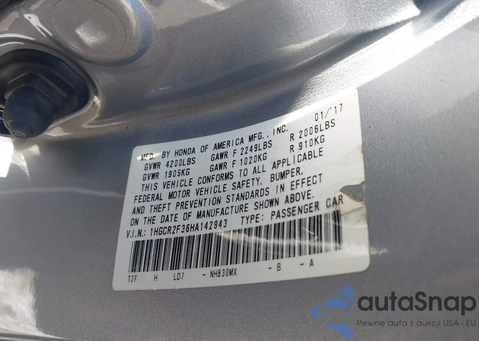LOT: 43891361 VIN: 1HGCR2F36HA142943