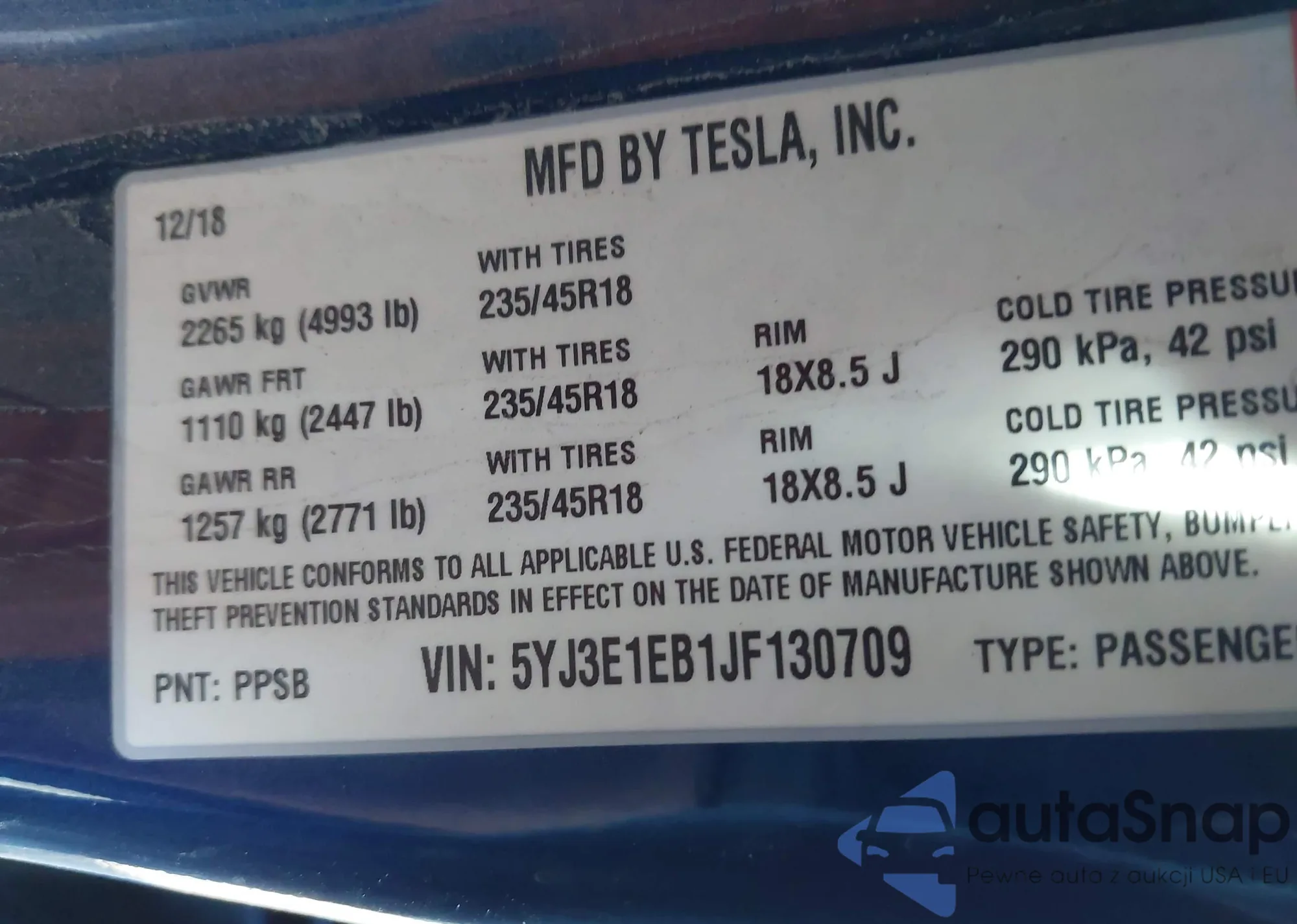 • VIN 5YJ3E1EB1JF130709