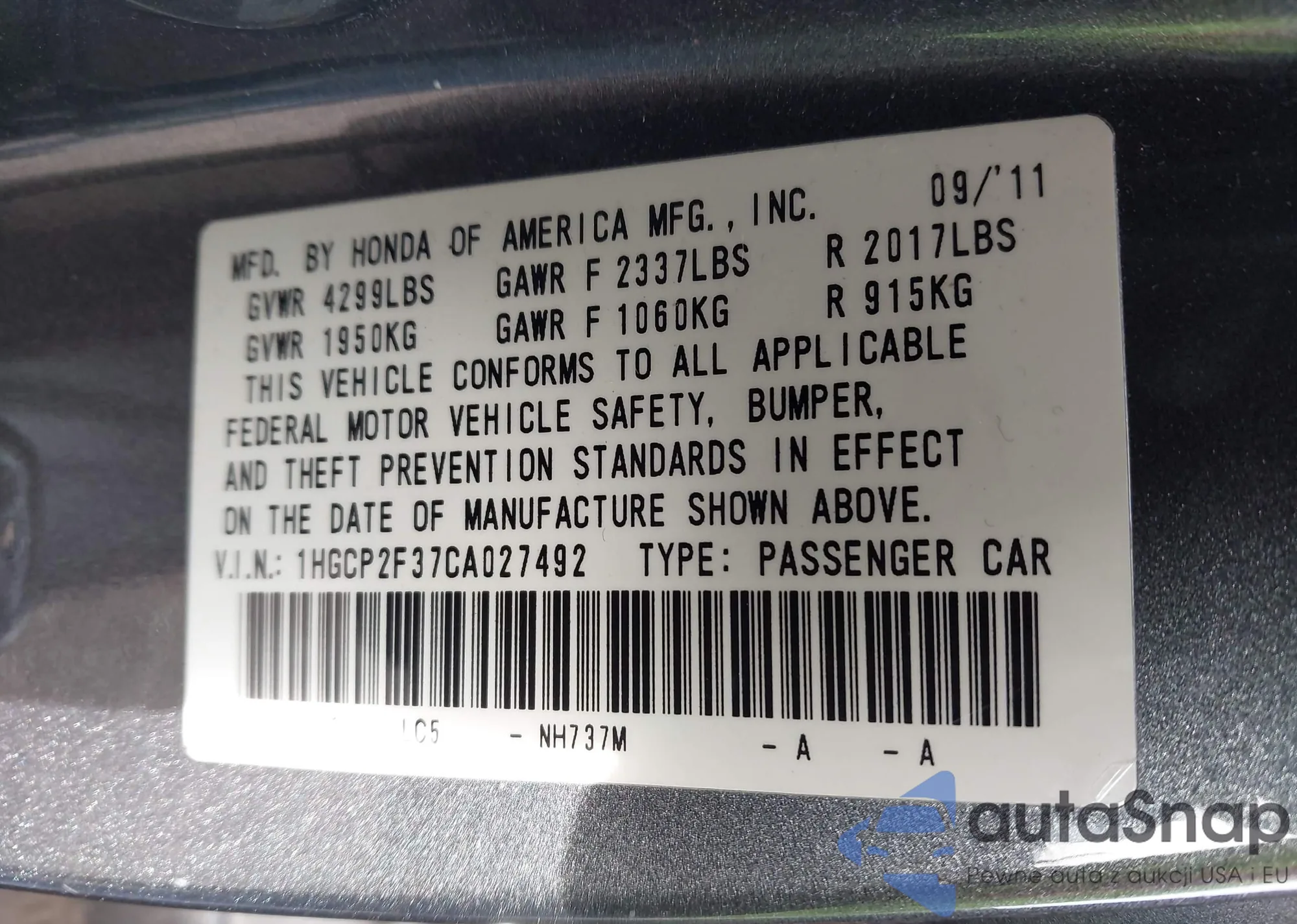 LOT: 43880146 VIN: 1HGCP2F37CA027492