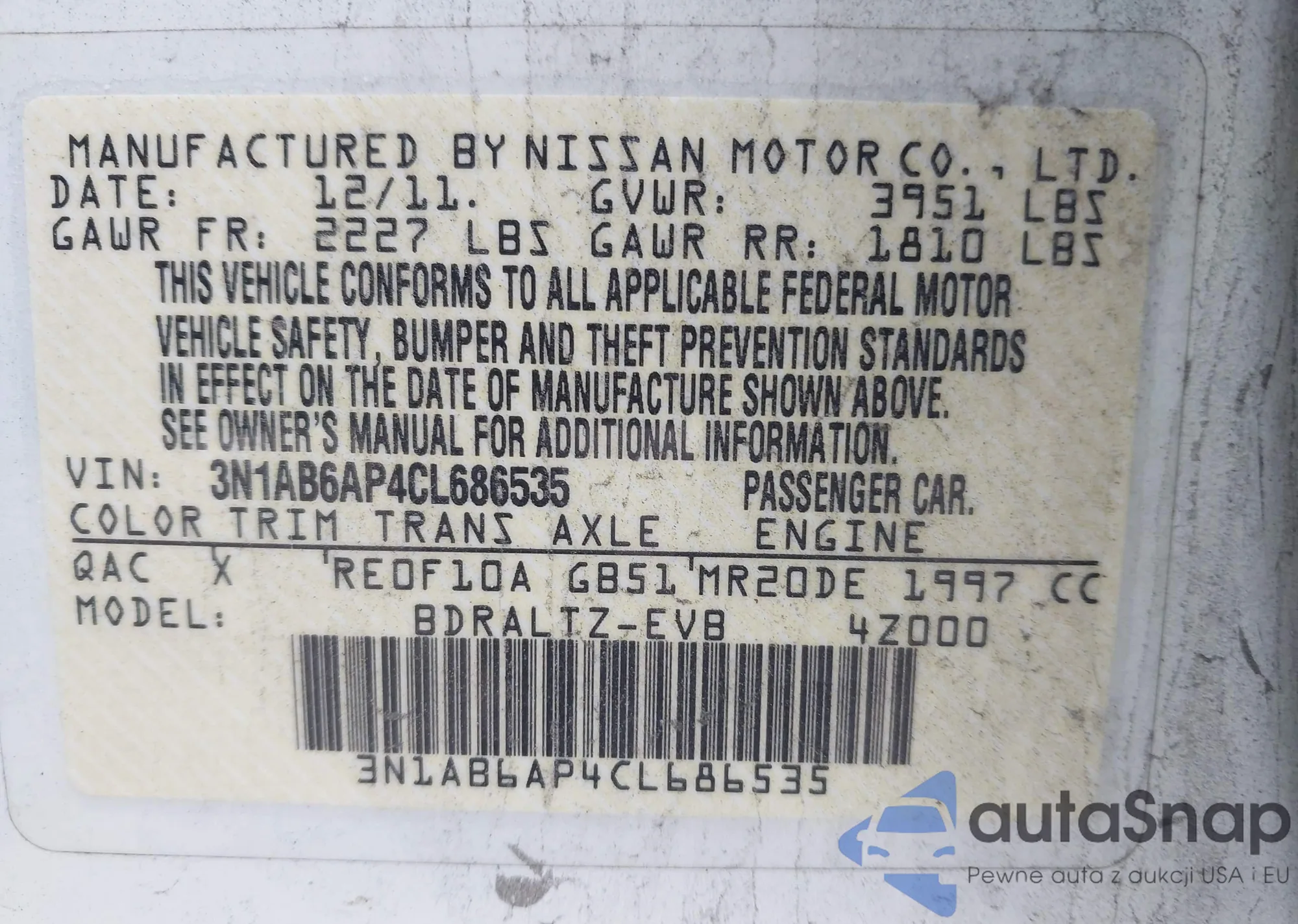 LOT: 43931456 VIN: 3N1AB6AP4CL686535