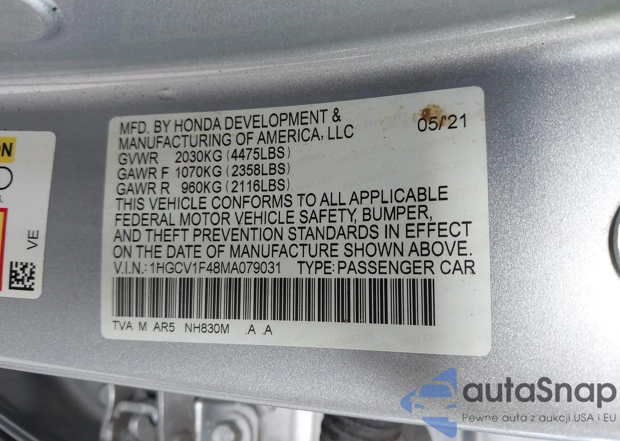 LOT: 43530177 VIN: 1HGCV1F48MA079031
