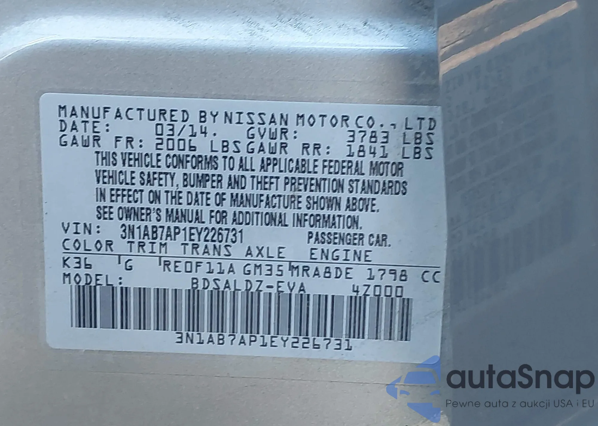 • VIN 3N1AB7AP1EY226731
