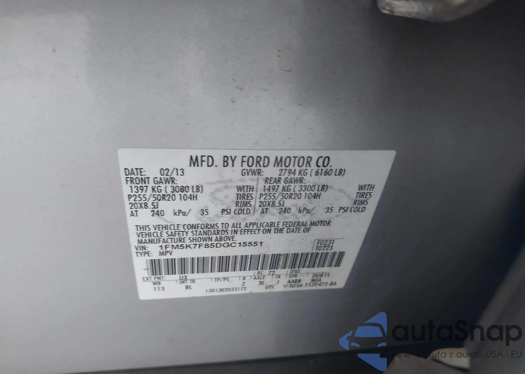 LOT: 43912651 VIN: 1FM5K7F85DGC15551