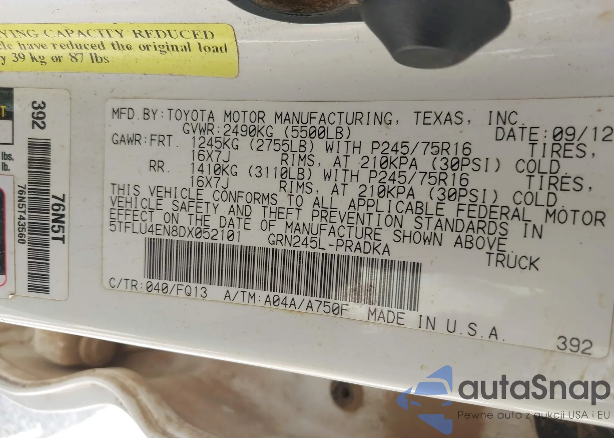 • VIN 5TFLU4EN8DX052101
