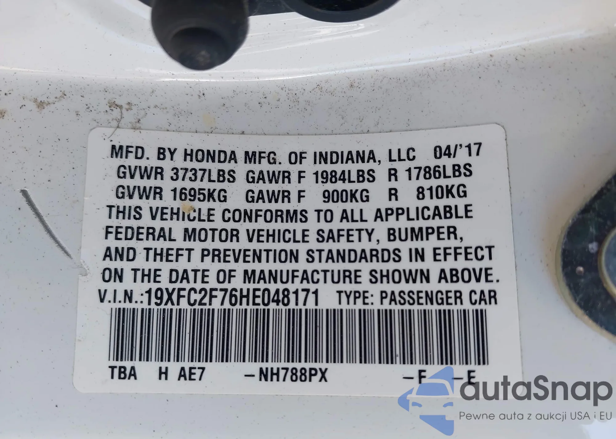 LOT: 43761497 VIN: 19XFL1H89NE009540