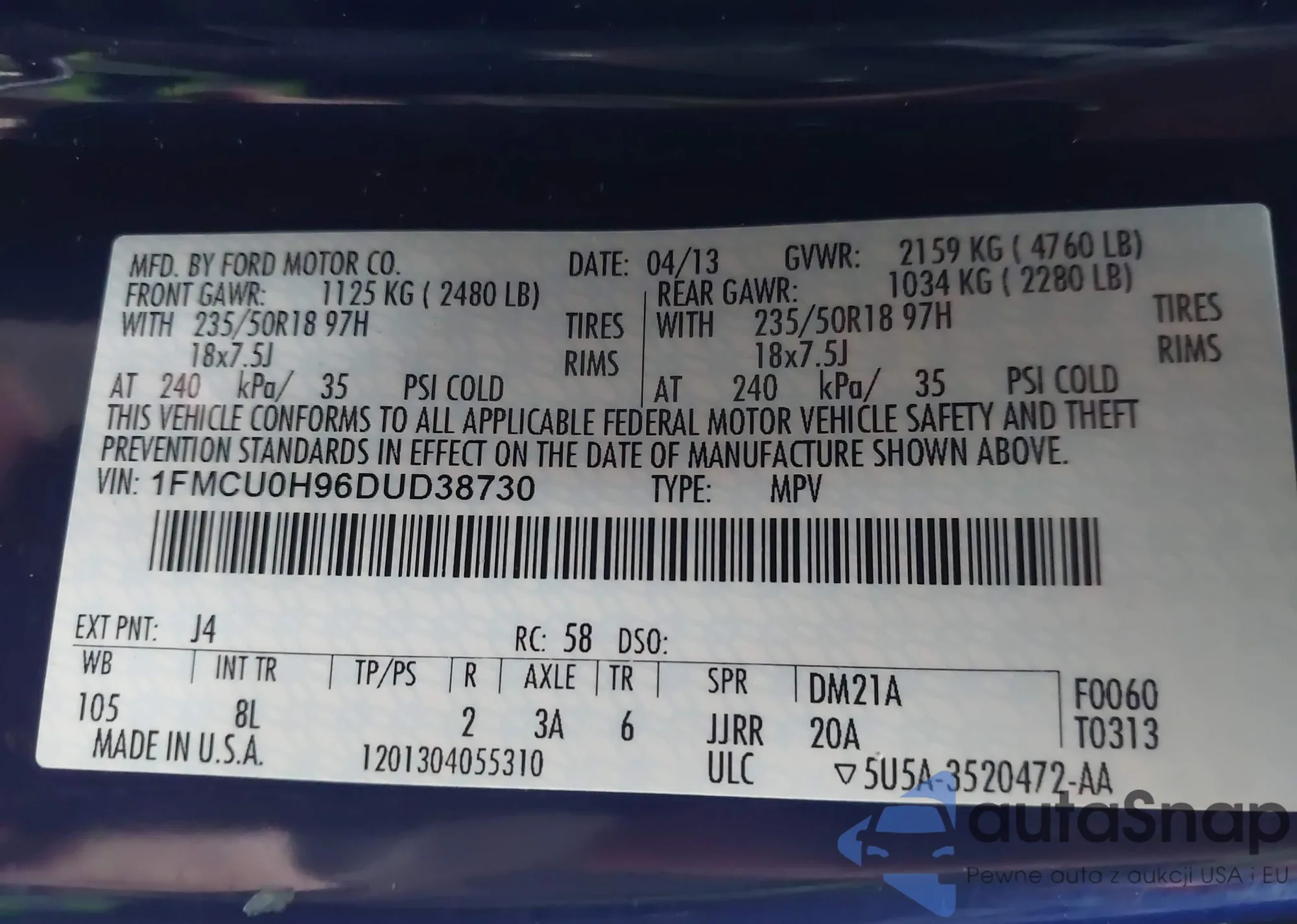 • VIN 1FMCU0H96DUD38730