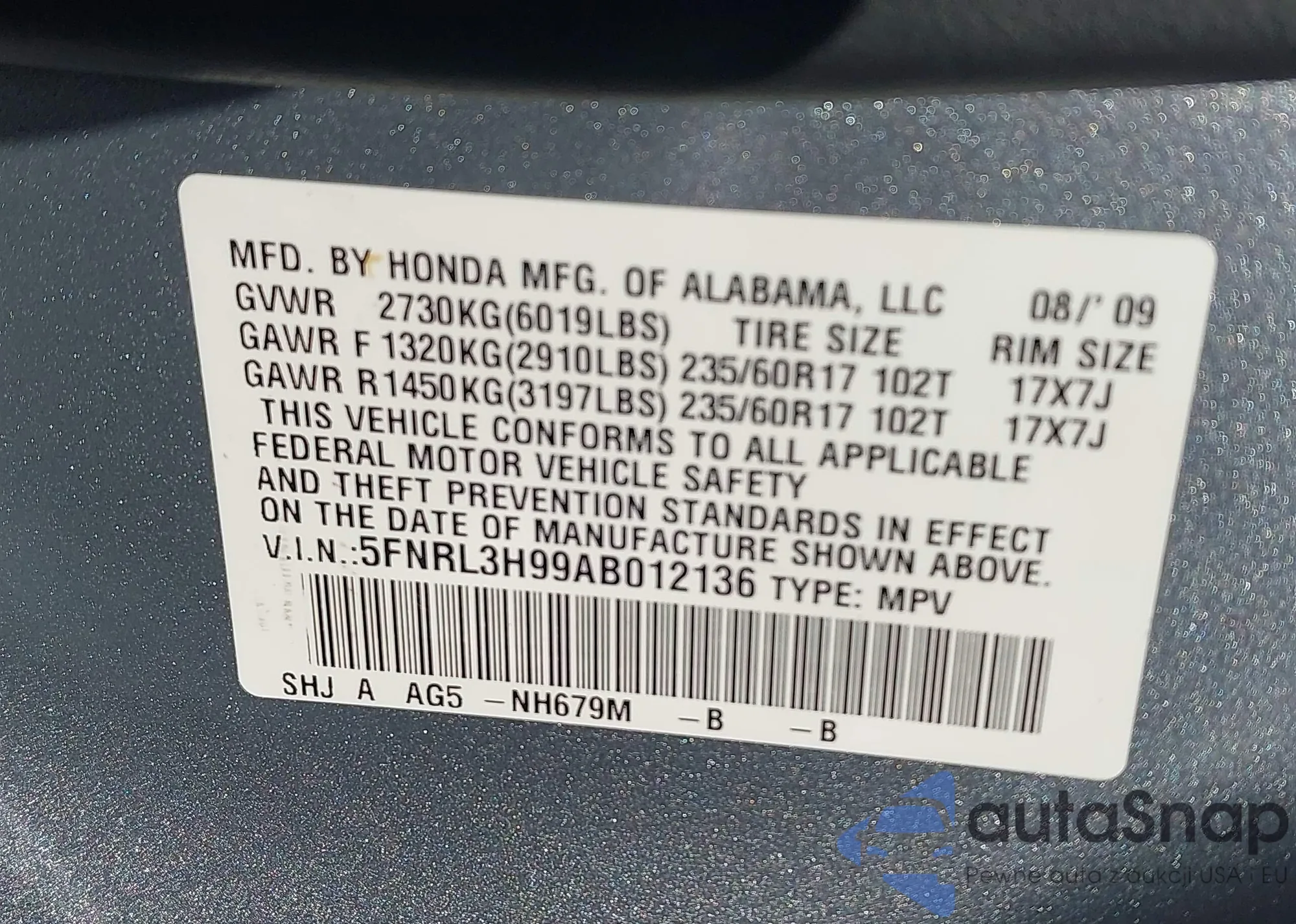 • VIN 5FNRL3H77AB107616