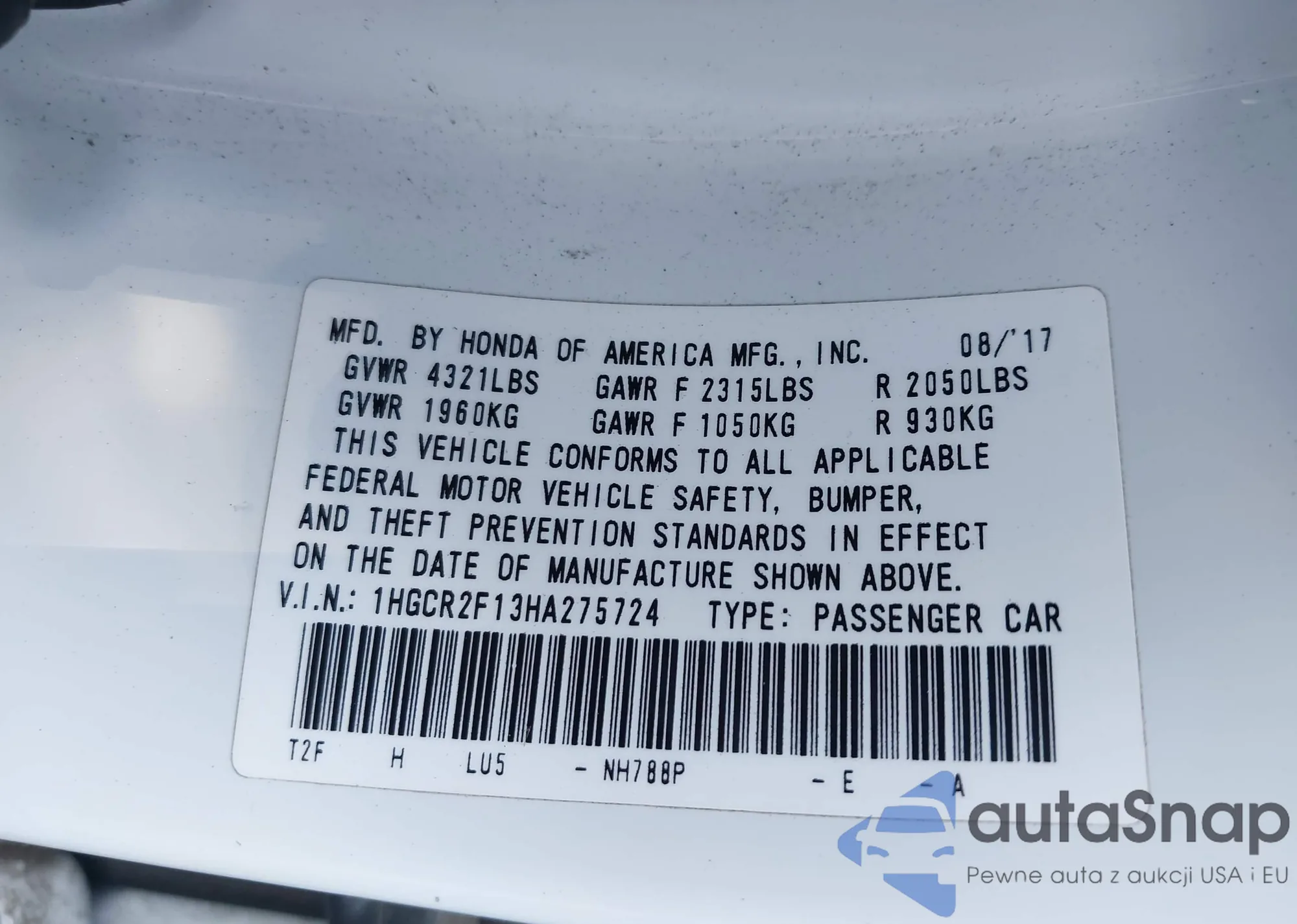 LOT: 43803713 VIN: 19XFA1F50AE021567